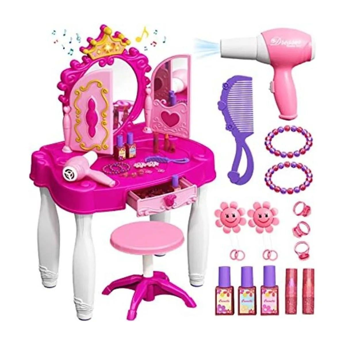 Lights and Music When the mirror is on, immerse your child in the princess kids dresser with heartshaped lights and magical music effects. Girls can also use a safe and really effective blow dryer to do hair for their pals and dolls.