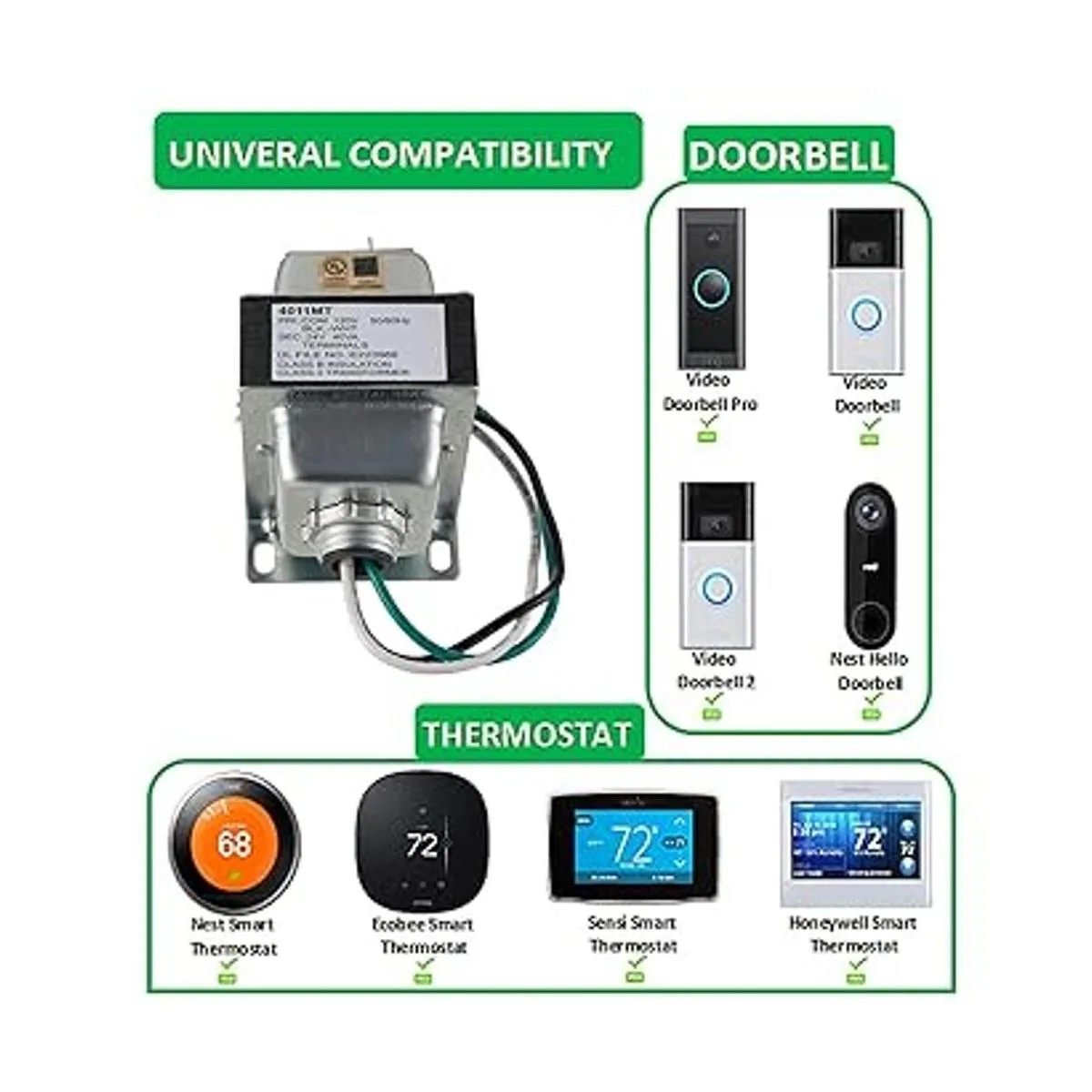 Este transformador de 24 V se adapta a termostatos inteligentes Honeywell y Sensi; Nest, Ecobee, también compatible con Ring Video Doorbell, Ring Video Doorbell 2, Ring Video Doorbell Pro, Nest Skybell Doorbell y otros dispositivos que requieren una potencia constante de 24 voltios para su funcionamiento