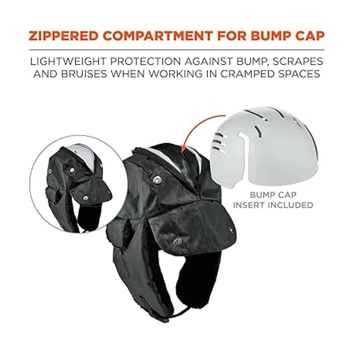 The NFerno 6802ZI Zippered Trapper Hat with Bump Cap Insert provides warmth from extreme cold, as well as lightweight protection from bumps, scrapes, bruises and other minor head injuries. Wear alone as a classic aviator hat or open the top zippered compartment to add the 8945 Universal Bump Cap Insert included for work in cramped spaces. This trapper hat features a windproof and waterresistant oxford nylon shell lined with 40 grams of 3M THINSULATE Insulation for comfortable warmth in extreme conditions. A waterresistant crown lining prevents sweat or moisture from being absorbed into the lining to keep you dry and warm. Ear flaps can be buttoned up for improved hearing through the small ear holes or down for increased warmth. A chin strap with YKK buckle makes for an adjustable fit, and a reflective accent on the back keeps workers safe and seen. Included with the trapper hat is a Skullerz 8945 Universal Bump Cap Insert.