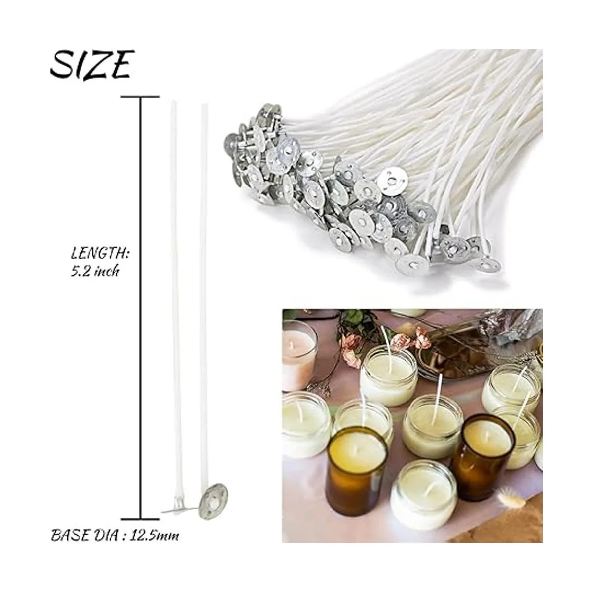 60 mechas de vela preenceradas y con pestañas: longitud de las mechas: 5.2 pulgadas. Diámetro de la base: 0.492 in. Las mechas están hechas de algodón, tampoco contienen plomo ni zinc. Sin humo negro ni mal olor durante la combustión.