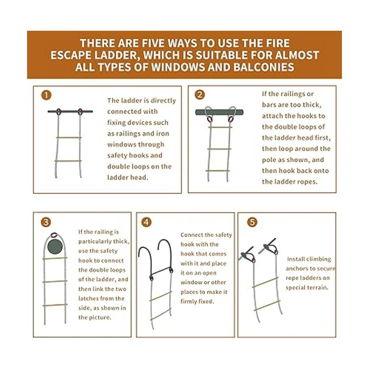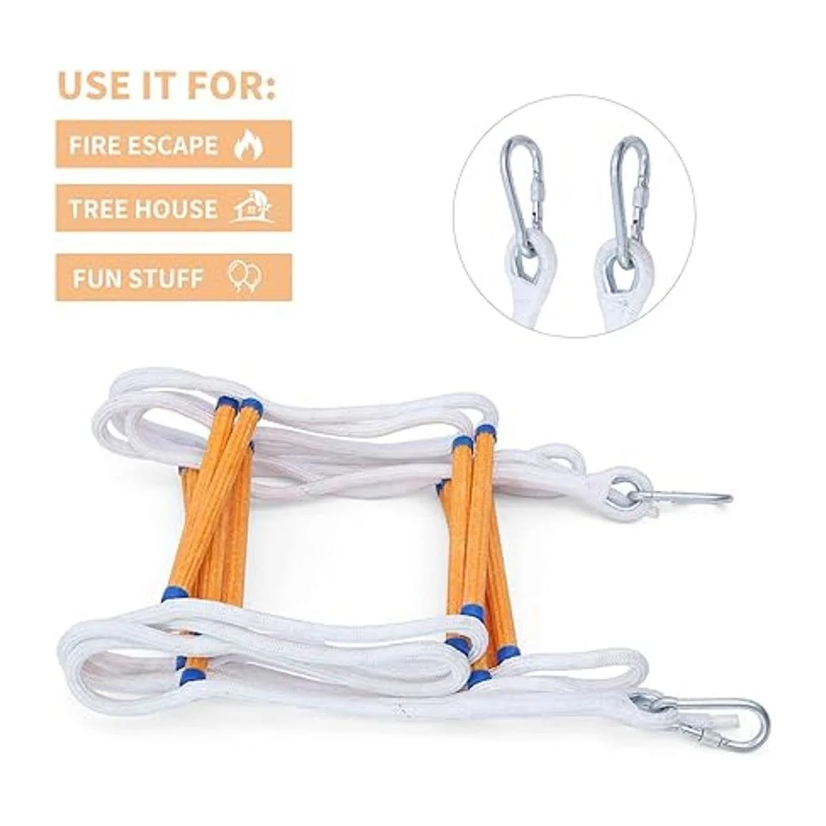Diseño sólido y estable: esta escalera de escape de incendios tiene multifunción. Está hecho de cuerda gruesa de alta calidad de hasta 2000 libras de resistencia a la rotura y está equipado con mosquetones completos de 11 KN, por lo que es imprescindible para la oficina de educación en casa que quiere mantenerse segura.