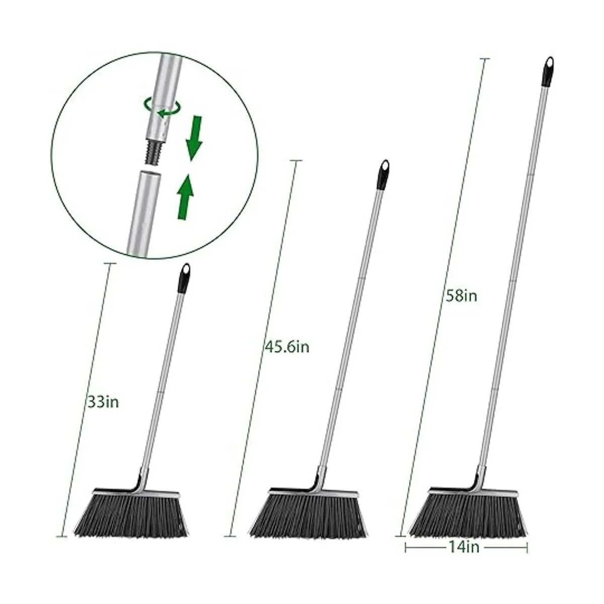 Escoba de mango extra largo para exteriores: escoba en ángulo con vástago ajustable de 58 pulgadas, por lo que no doblarás la espalda y la altura se puede ajustar de acuerdo a las necesidades personales. La cabeza de las escobas para exteriores también tiene 14 pulgadas, la zona exterior para barrer basura es más grande.
