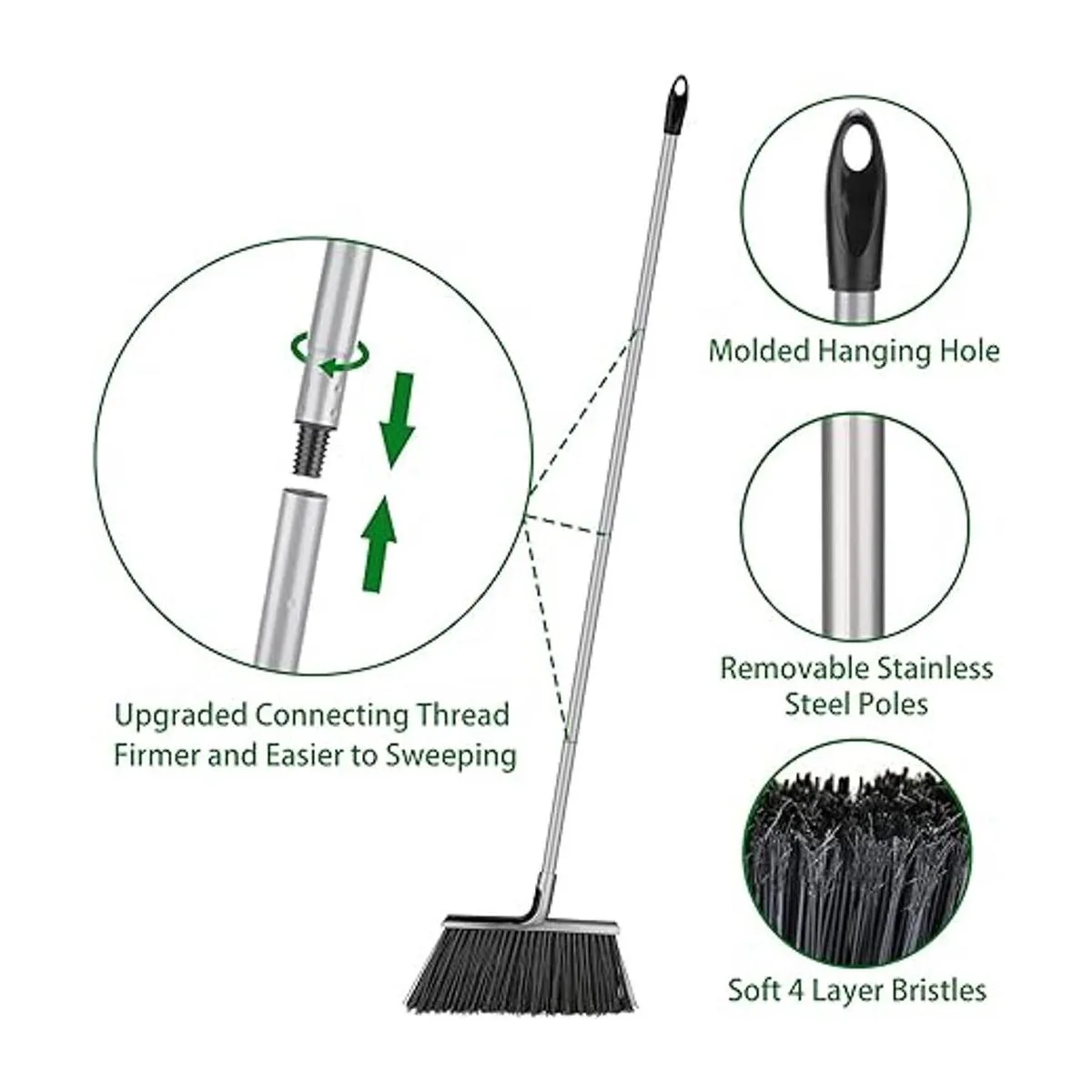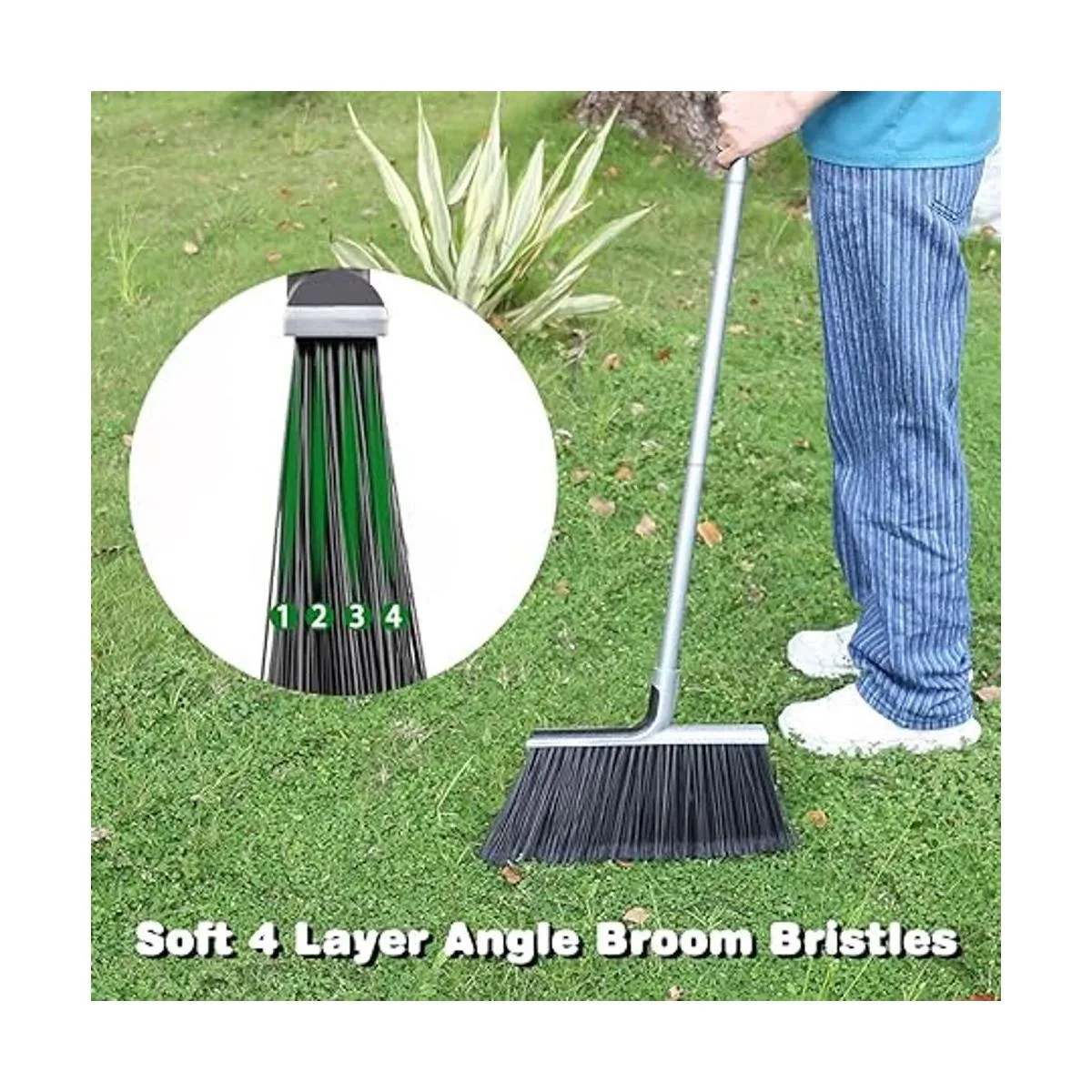 Cerdas de escoba de ángulo de 4 capas: las cerdas del patio de escoba al aire libre se aumentan de tres filas a cuatro filas. Escoba de garaje con cerdas rígidas de 4 capas tiene suficiente fuerza para barrer cosas pesadas con velocidad hacia adelante o eficiencia como suciedad y grava, y hojas que tienden a pegarse al suelo.