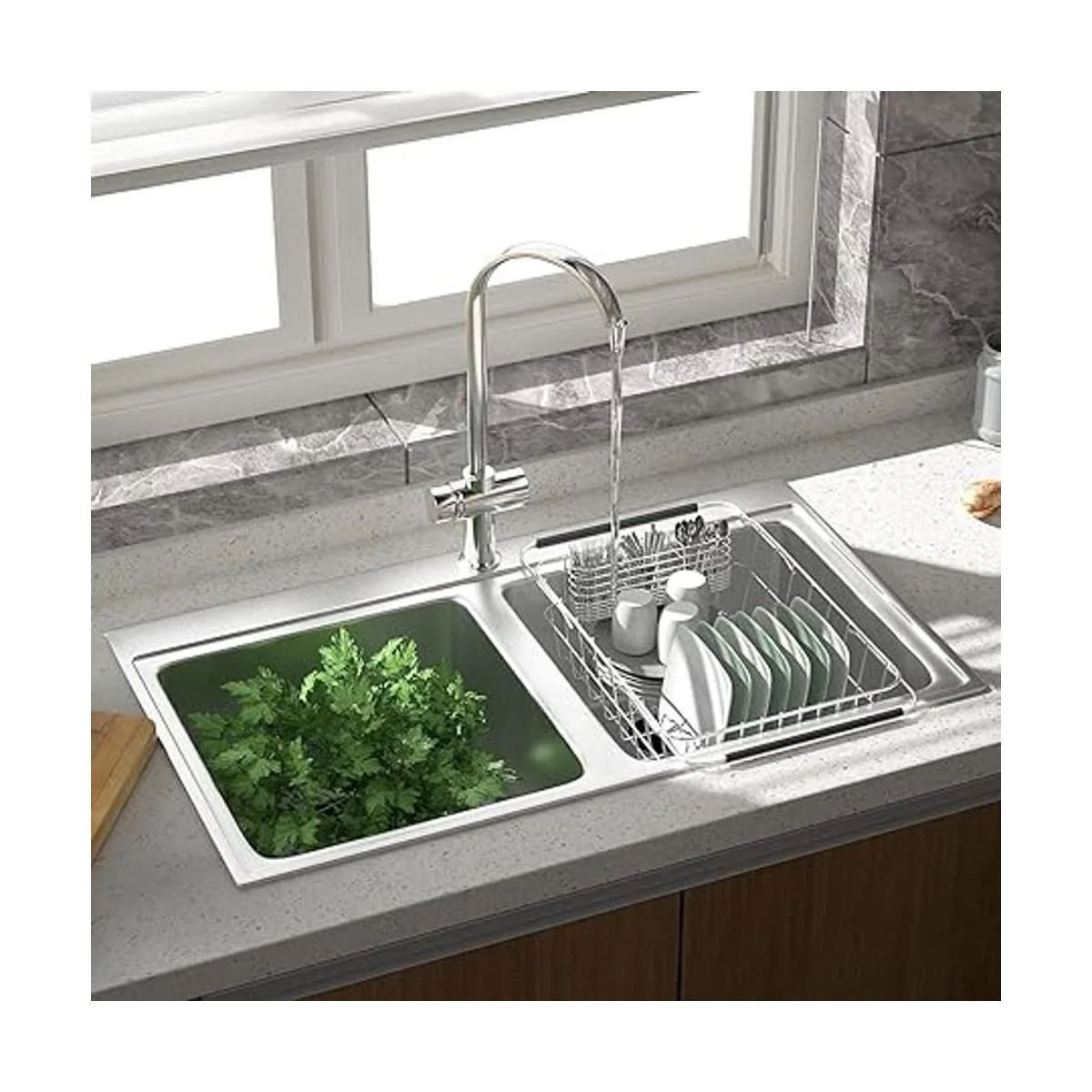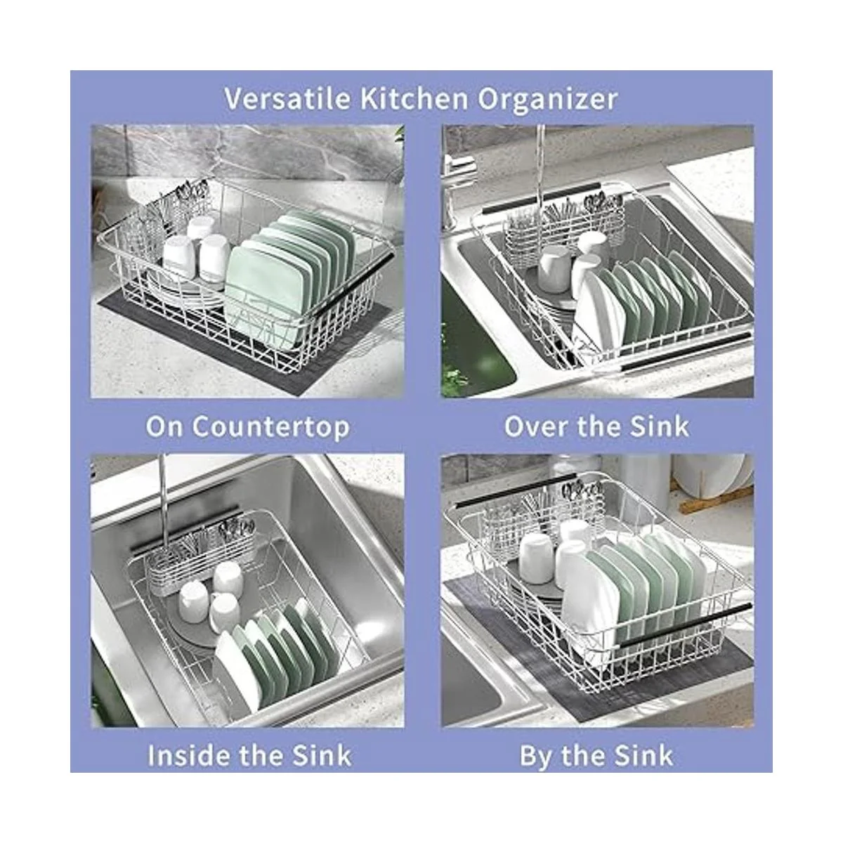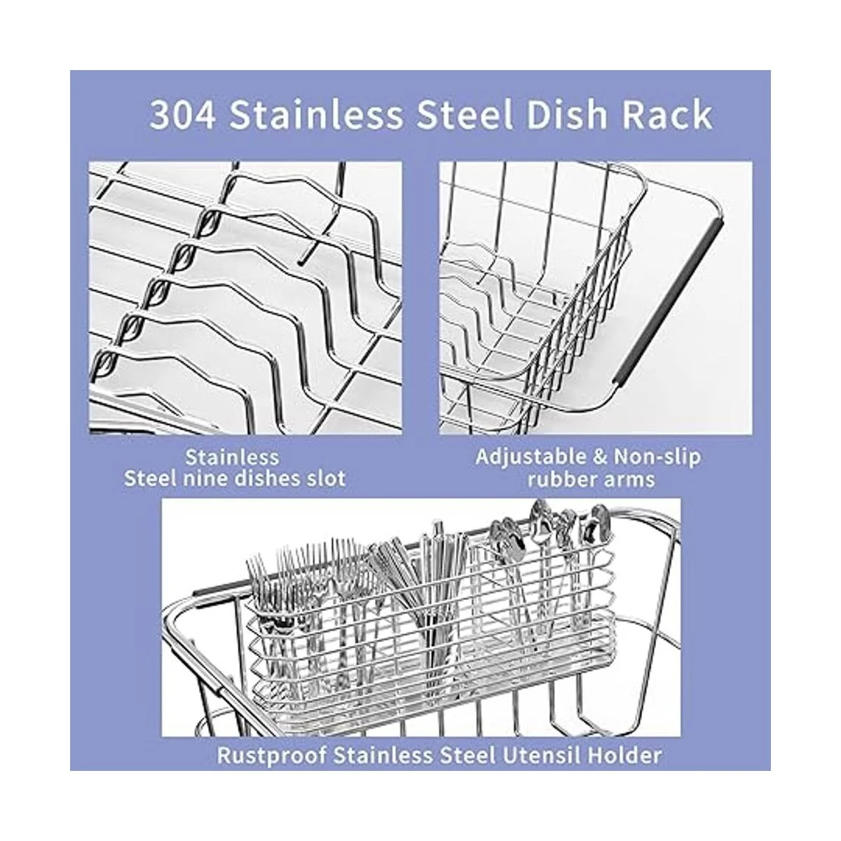 Escurridor de platos en el fregadero ajustable de 14.96 a 20.59 pulgadas, estante organizador de metal de acero inoxidable 304 con soporte de utensilios de acero inoxidable sobre encimera del fregadero