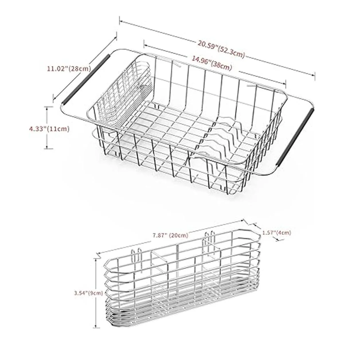 Dimensiones La dimensión de nuestro escurridor de platos es de 14.96 pulgadas x 11.02 pulgadas x 4.33 pulgadas, después de expandirse, 20.59 pulgadas x 11.02 pulgadas x 4.33 pulgadas