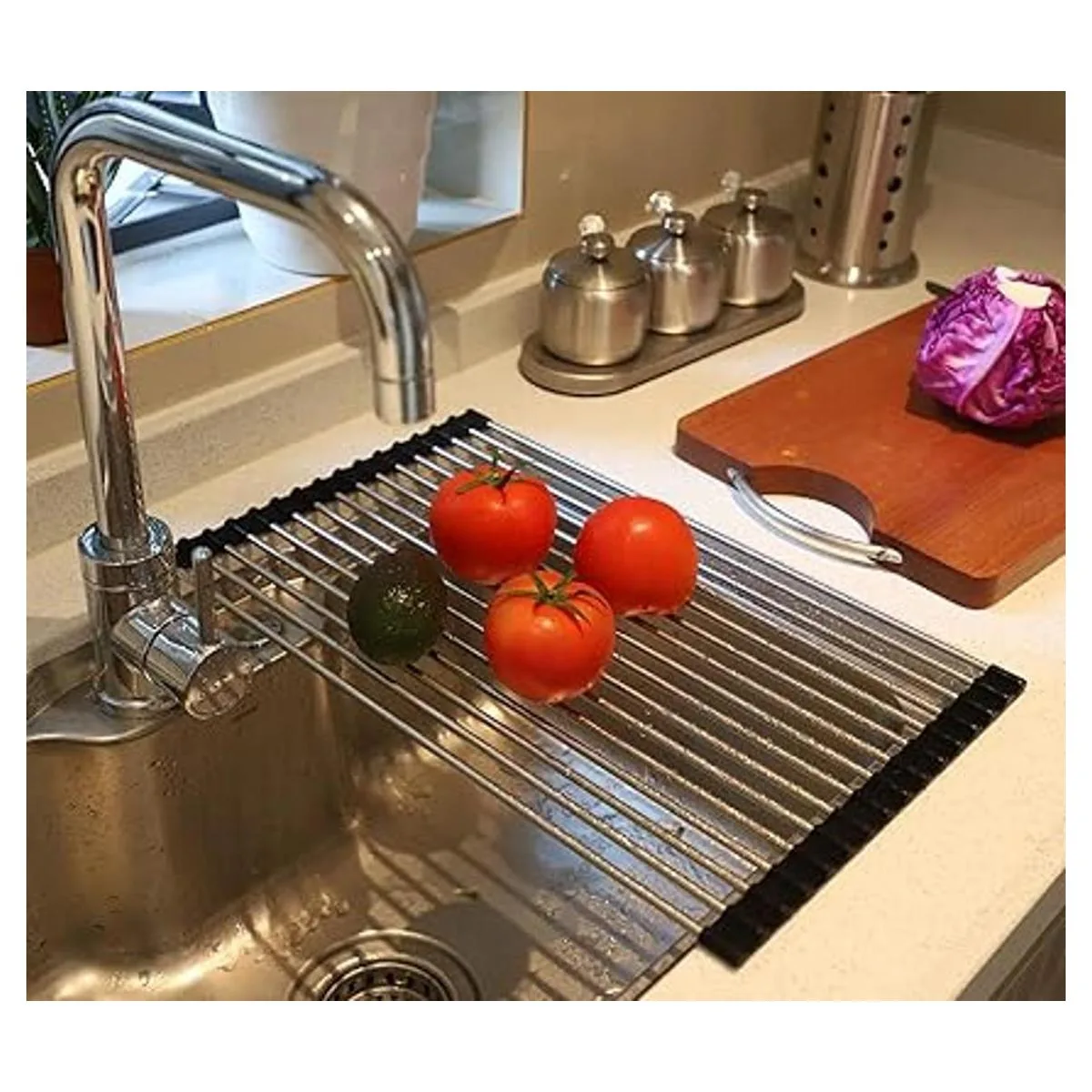 Multiusos: esta es una herramienta de cocina multifunción brillante, este escurridor de platos sobre el fregadero puede secar al aire vajilla lavada, utensilios de cocina, cubiertos y utensilios de cocina, este tapete de secado de platos también se puede utilizar como una alfombrilla de fregadero de cocina, soporte de esponja, hamaca de frutas, colador sobre el fregadero, organizador de fregadero de cocina y almacenamiento de caravana.