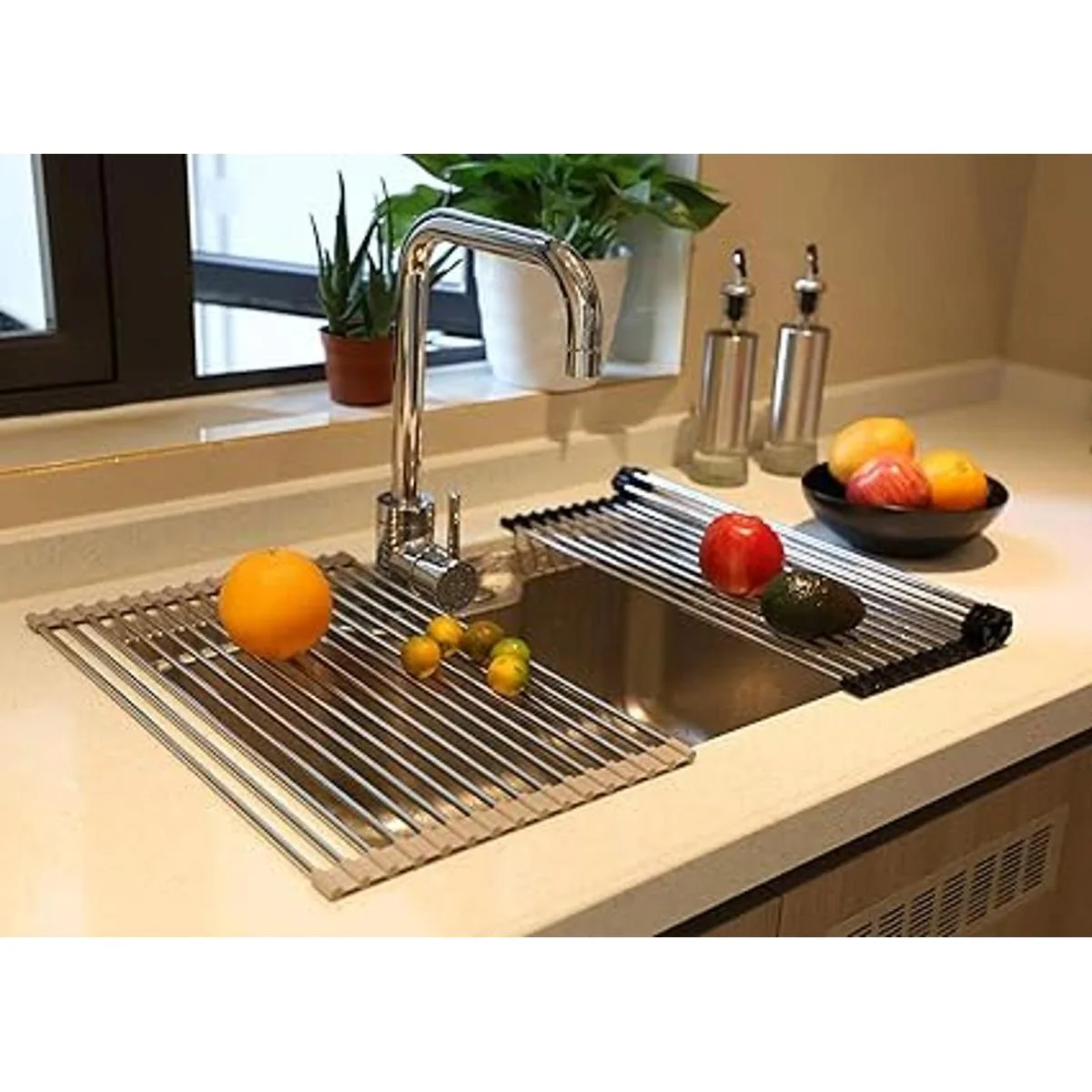 Resistente al calor: escurridor de platos resistente al calor para encimera de fregadero de cocina y estante de drenaje de platos enrollable, este escurridor de platos de cocina es resistente al calor y puede resistir hasta 450 F. Sin BPA y puedes pasar agua caliente sobre el estante de platos de acero inoxidable, e incluso colocar la olla caliente en los estantes de platos sin causar ningún daño.