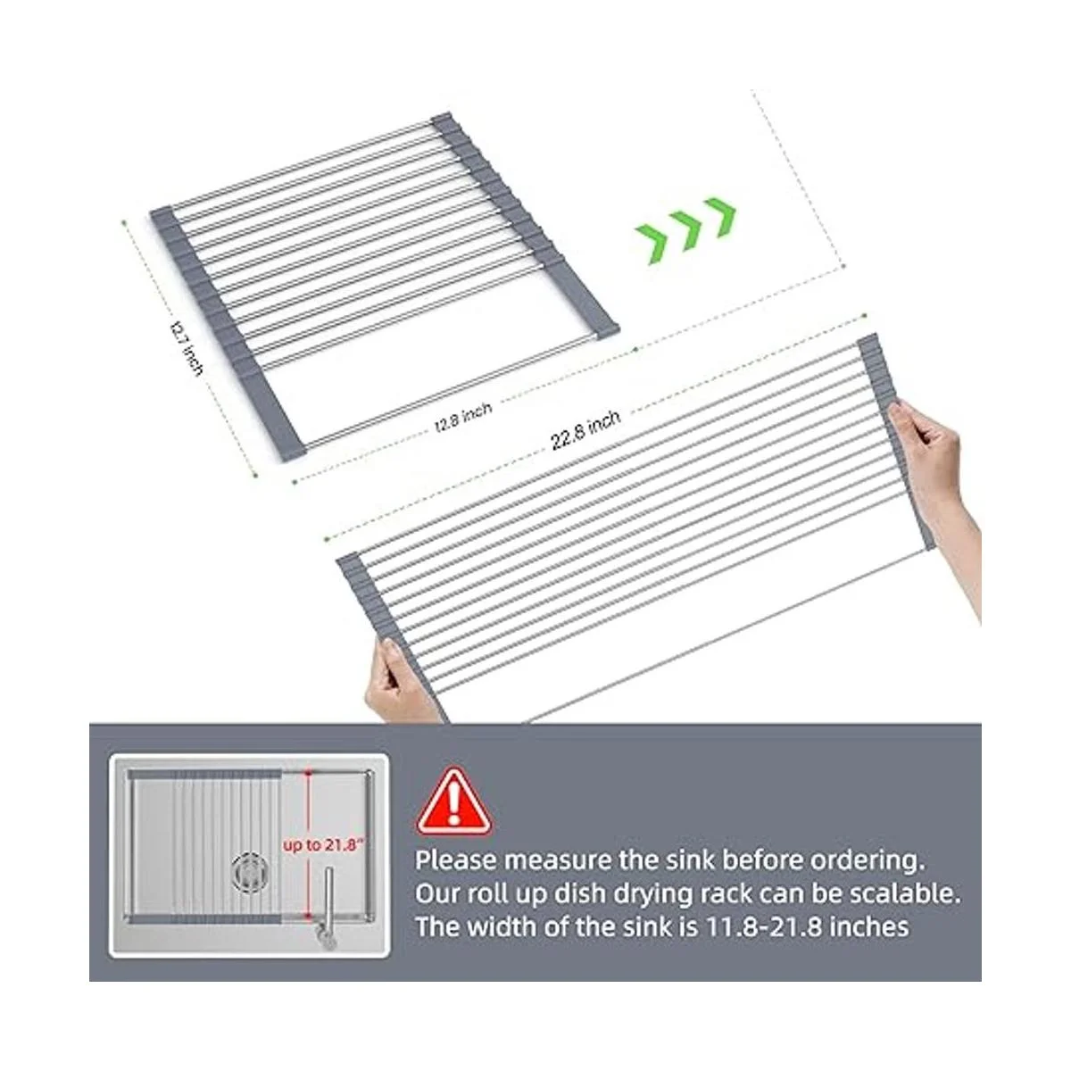 Escurridor de platos expandible enrollable de hasta 22.8 pulgadas con 2 cestas de almacenamiento, escurridor de platos enrollado sobre el fregadero, escurridor de platos en el fregadero, plegable, enrollable, para platos de cocina, tazas, frutas, tenedores