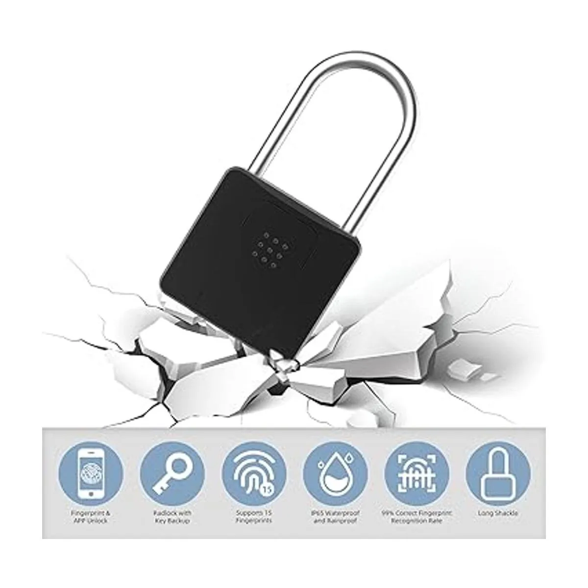 Construcción robusta: la viga del candado está hecha de acero inoxidable para una excelente resistencia a manipulaciones. IP65 resistente a la intemperie protege contra el polvo y el agua. También hay una cubierta protectora para el área de lectura de huellas dactilares, que es más duradera.