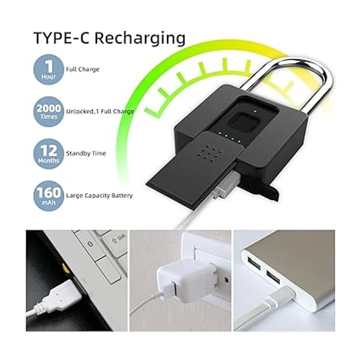 Largo tiempo de funcionamiento Los candados inteligentes tienen un menor consumo de energía y un tiempo de espera más largo. La batería de litio recargable por USB de 160 mAh puede soportar hasta 12 meses de tiempo de espera o 2000 veces de desbloqueo en una sola carga. Cuando no esté de batería, el bloqueo inteligente permanecerá bloqueado, simplemente conéctalo a una fuente de alimentación USB y recupera.
