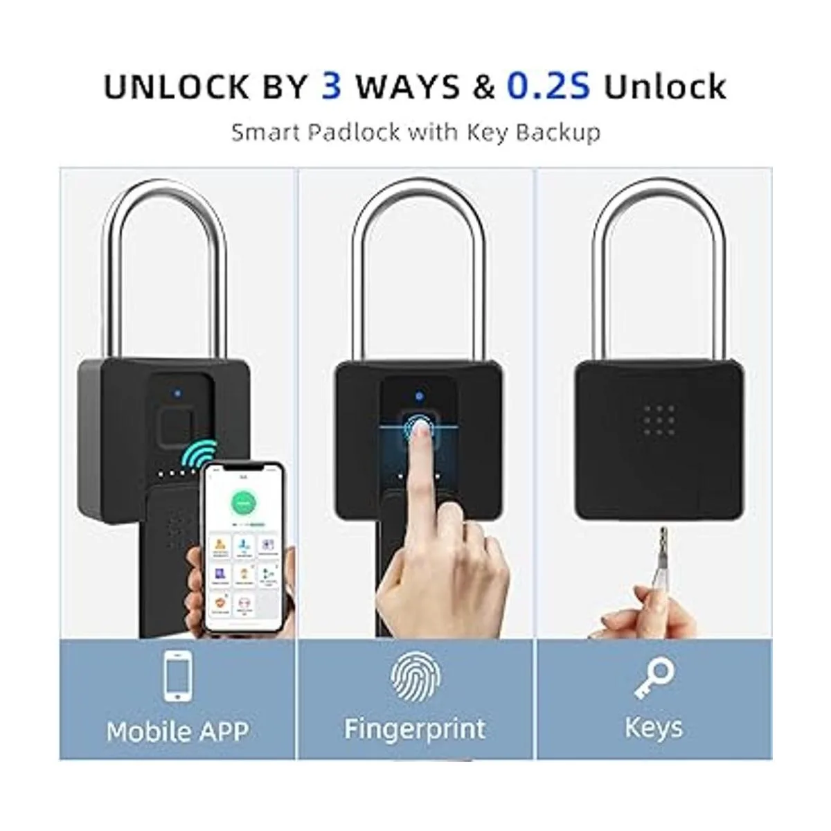 Grillete largo, portátil y amplios usos El bloqueo de casillero alargado mejora la practicidad del candado y es adecuado para cualquier escena. El candado Bluetooth de huellas dactilares Eseesmart es adecuado tanto para uso en interiores como temporal al al aire libre en gimnasio, escuela, oficina, puerta, valla, garaje, almacén, armario, cobertizo, maleta, bolso, equipaje, bicicleta, etc.