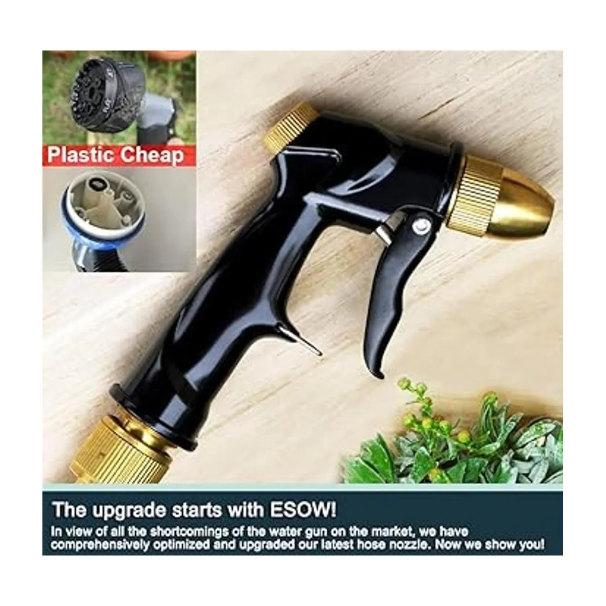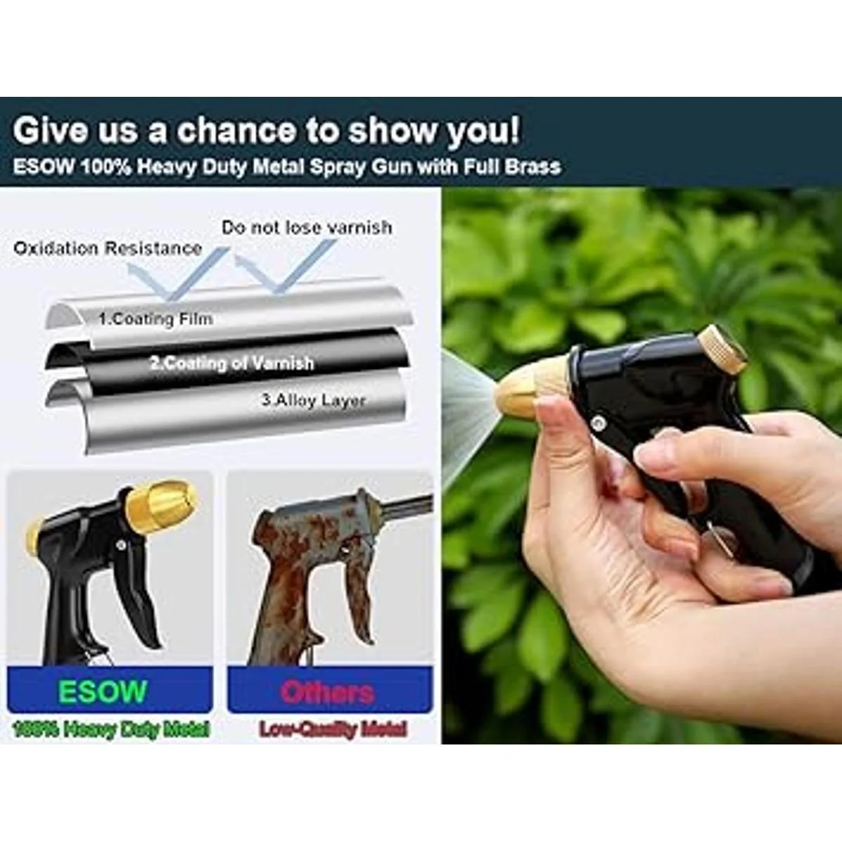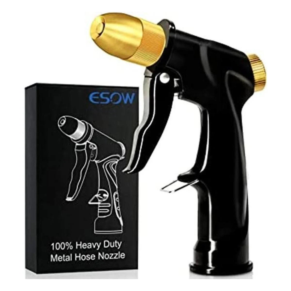 ESOW Boquilla de manguera para jardín, pistola de espray 100 metal resistente con boquilla de latón completo, boquilla de riego de alta presión, flujo de agua ajustable para regar plantas, bañar a las mascotas, lavar el auto, limpiar