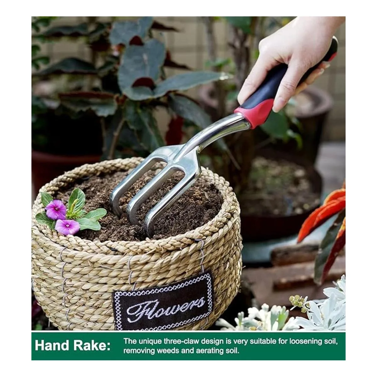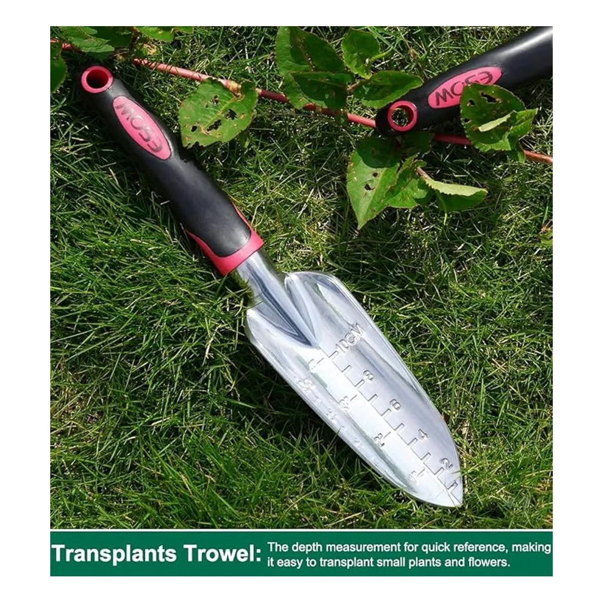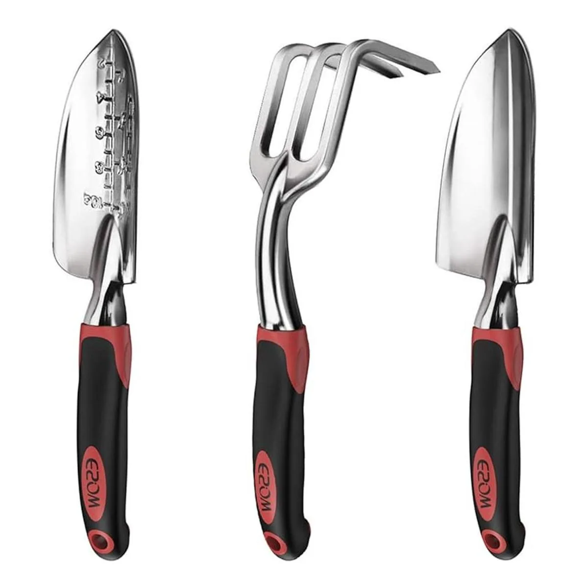 ESOW Juego de herramientas de jardín, 3 piezas de aluminio fundido resistente, incluye paleta de mano, paleta de trasplante y rastrillo de mano cultivador con mango ergonómico antideslizante de goma suave, regalos de jardín