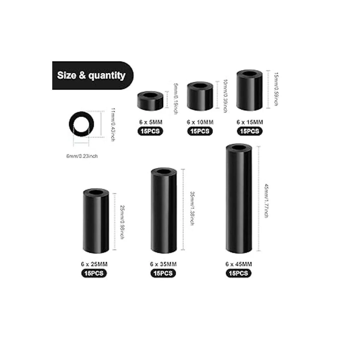 Varios tamaños: el diámetro exterior de estos kits de surtido de espaciadores redondos es de 0.433 in y el diámetro interior es de 0.236 in, viene con 6 longitudes diversas, incluyendo 0.197 in/0.394 in/0.591 in/0.984 in/1.378 in/1.772 in; varias especificaciones satisfacen diferentes demandas diarias, adecuado para la mayoría de los tornillos