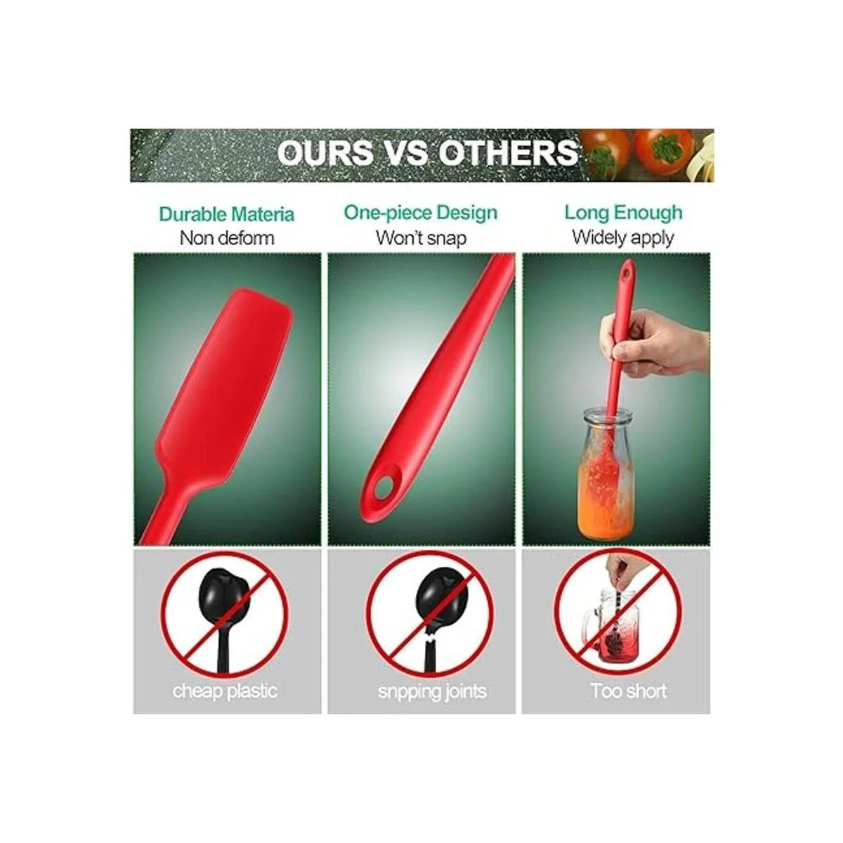 Contenido del paquete: recibirás 3 espátulas de silicona de mango largo en 3 colores diferentes, incluyendo negro, rojo y verde claro, cantidad suficiente puede satisfacer tus diferentes necesidades y varios colores son convenientes para que puedas distinguir y usar, que son prácticas herramientas de cocina para ayudarte a sacar diferentes tipos de mermeladas o condimentos de tarros fácilmente
