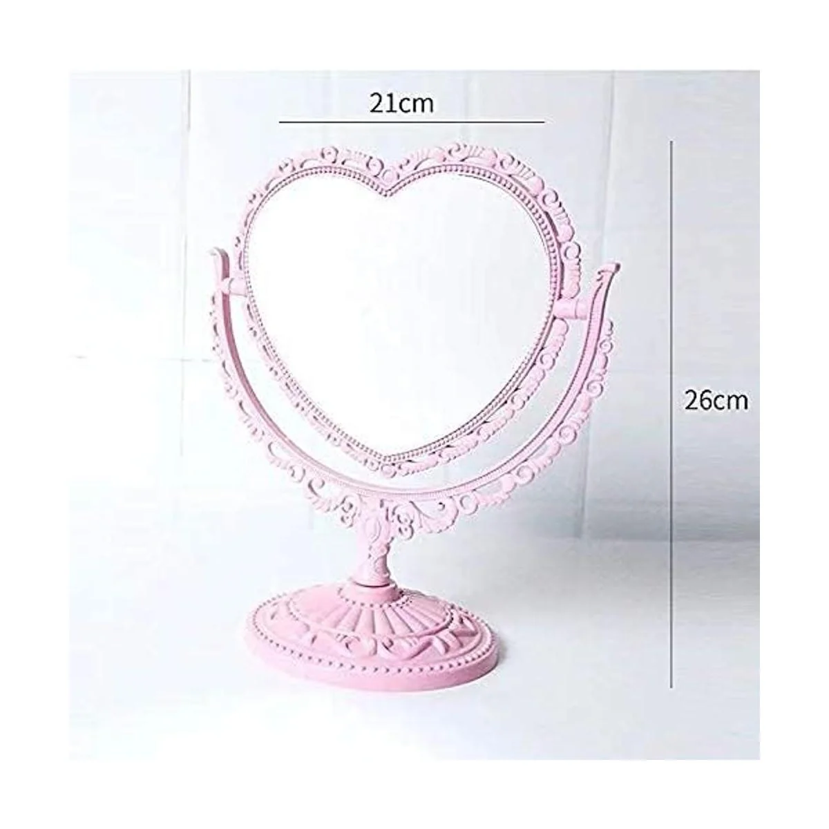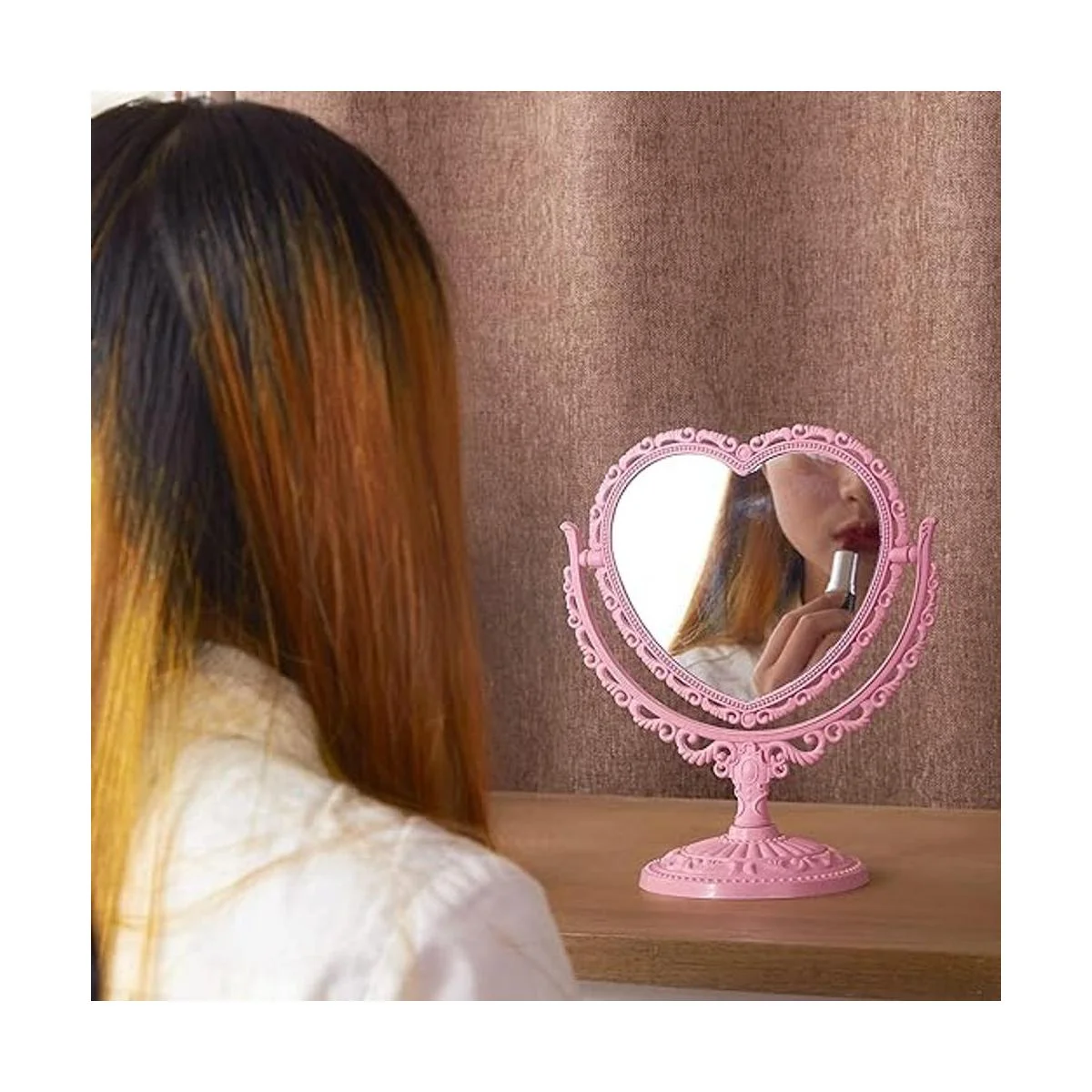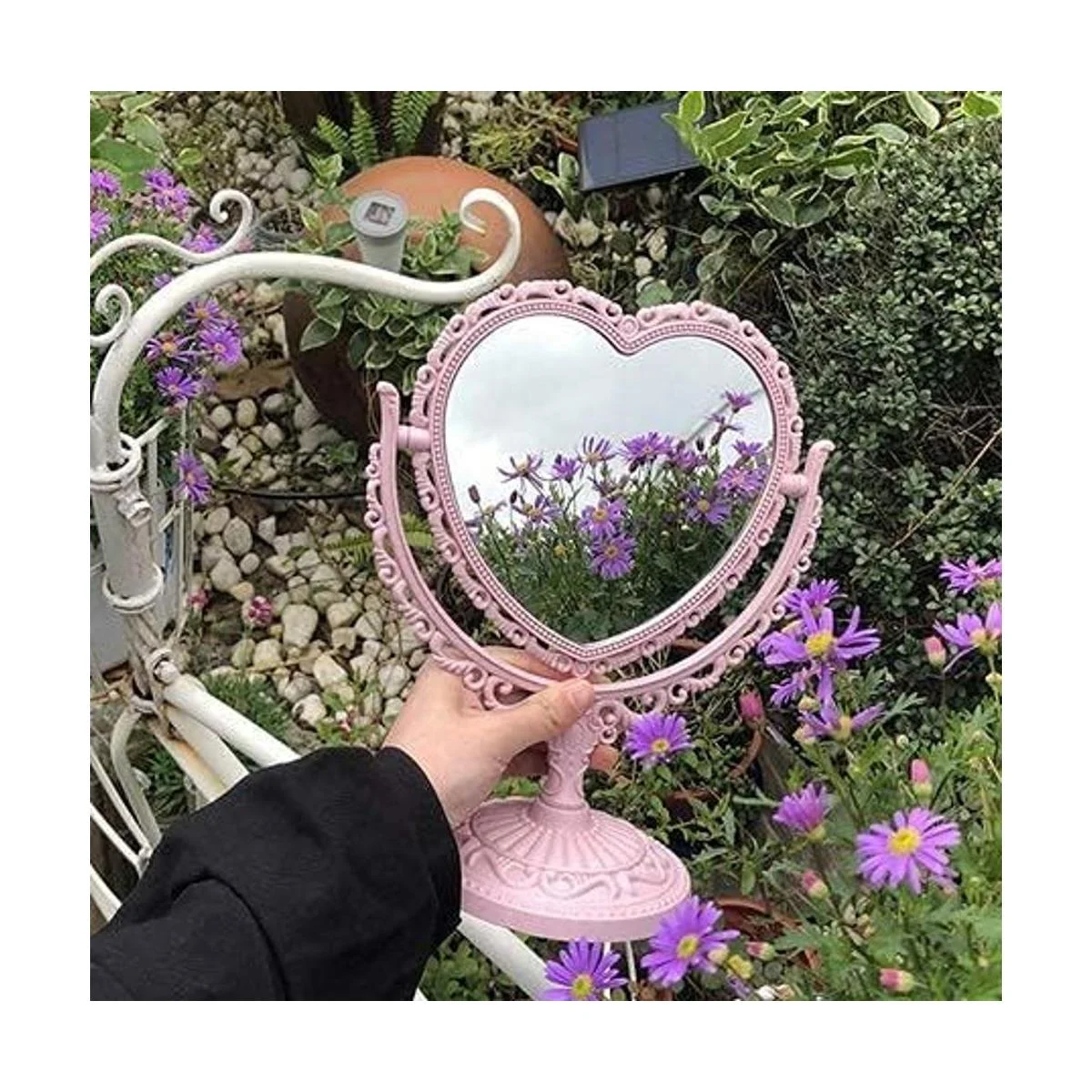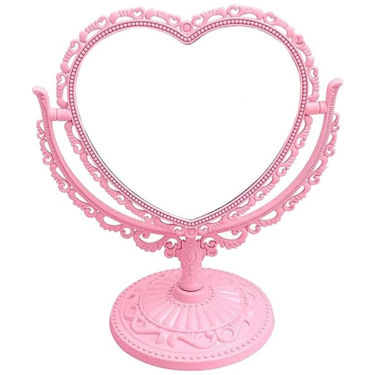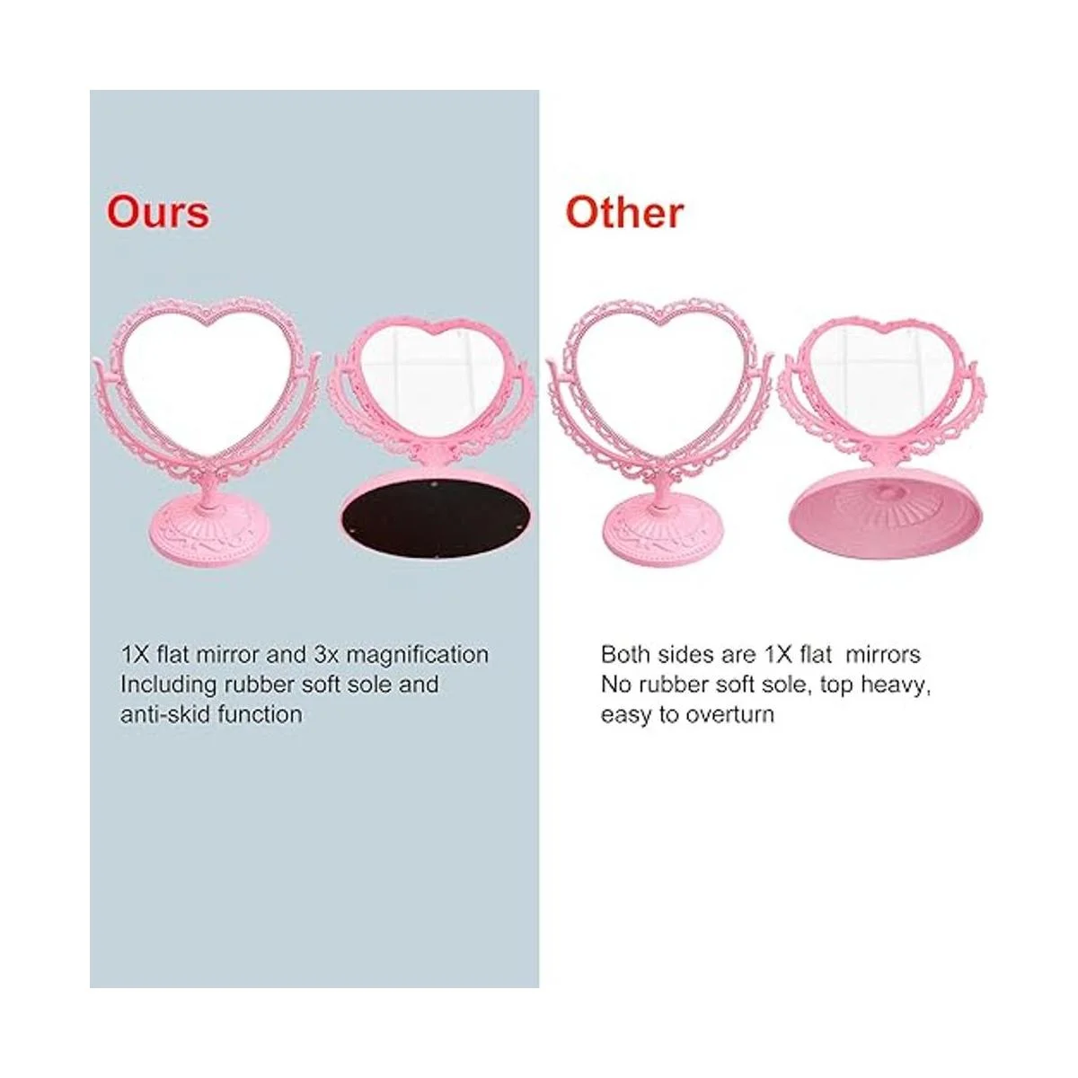 Espejo de tocador de mesa de 7 pulgadas, 1x3X, espejo de maquillaje de doble cara con rotación de 360 grados, espejo de tocador para baño y dormitorio rosa, en forma de corazón