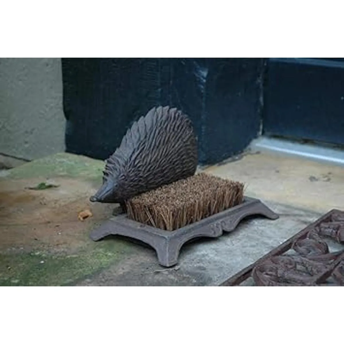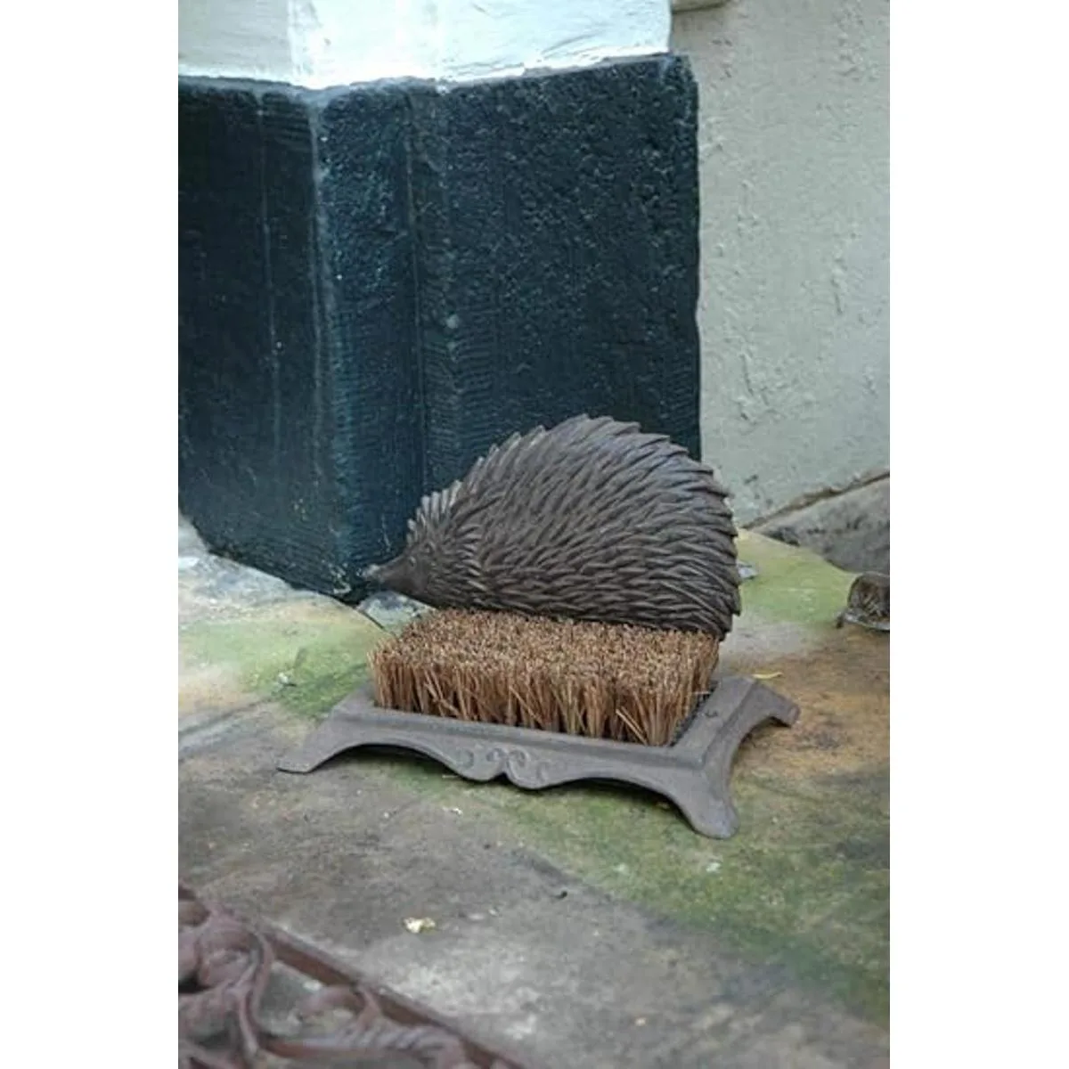 Hierro fundido marrón antiguo con cepillo de fibra de coco y diseño de erizo.