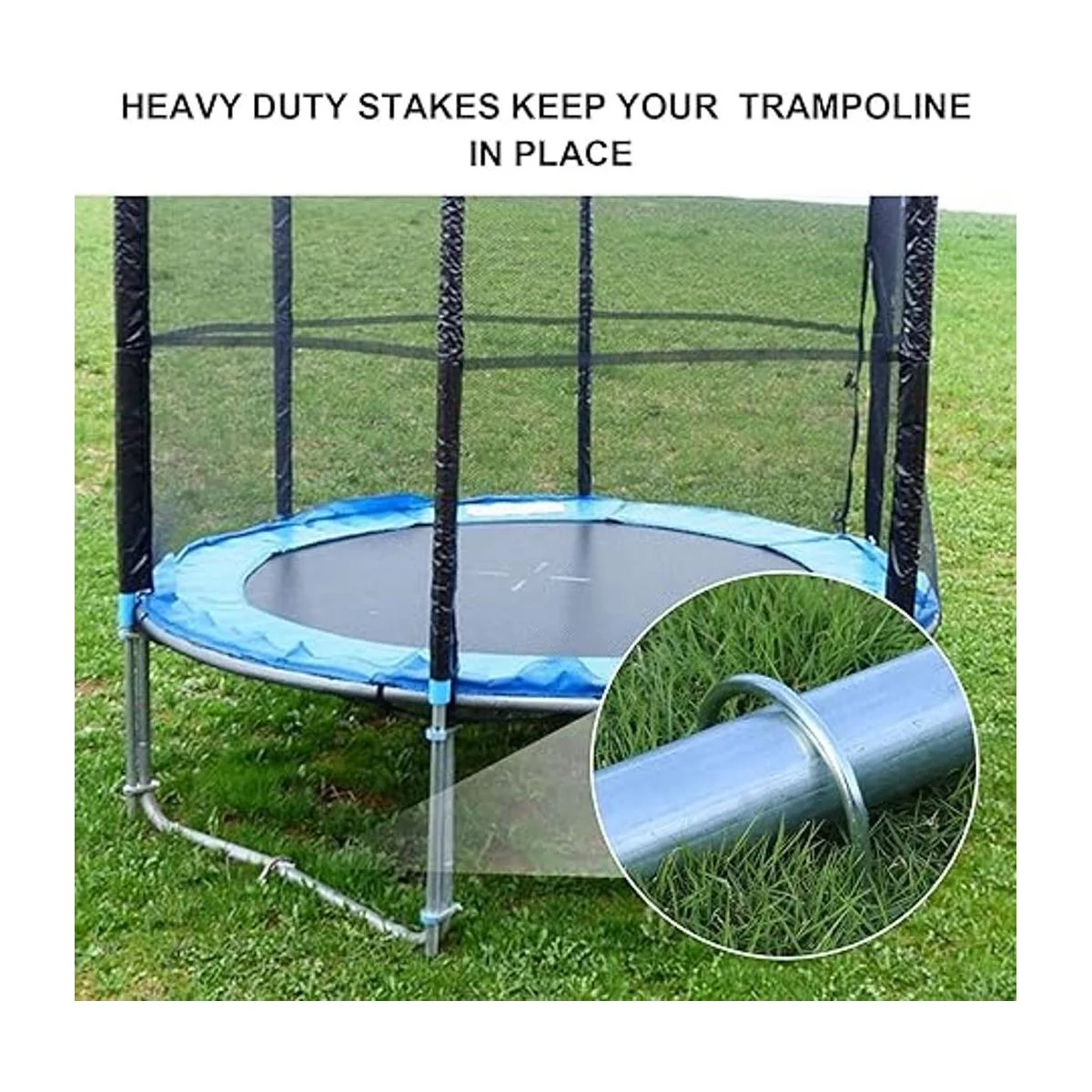 Acero galvanizado resistente, antioxidante y fácil de usar: kit de anclaje para cama elástica fabricado con acero ultra duradero, recubierto galvanizado, evita que las estacas se oxiden en exteriores. El diámetro del acero es de 0.25 pulgadas, es grande y fuerte para proporcionar seguridad adicional. Extremos afilados de estacas para una fácil inserción en el suelo.