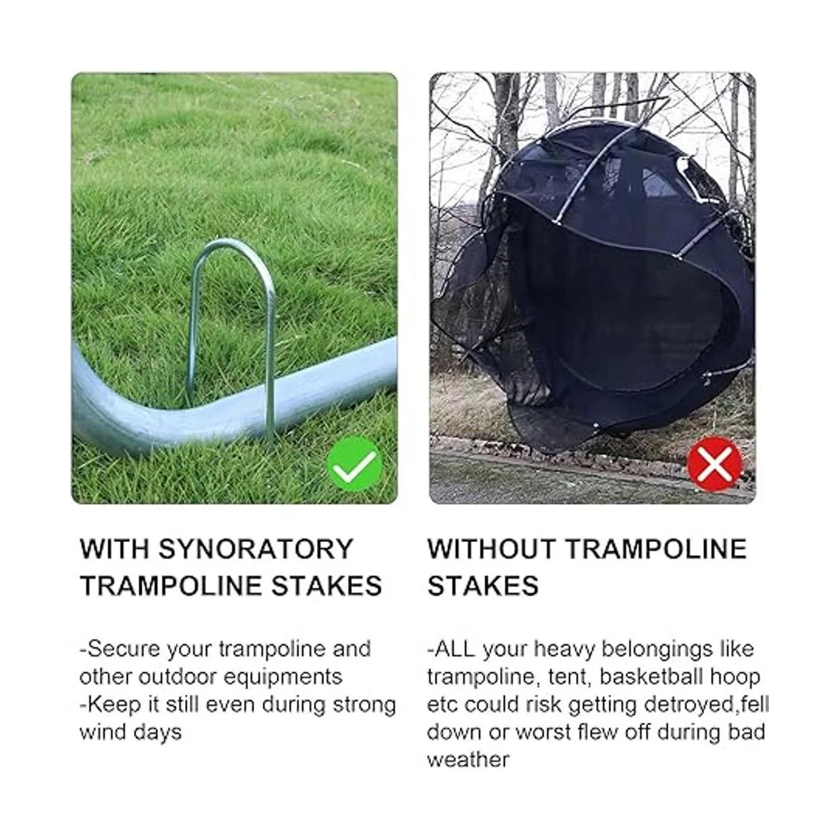 Las estacas de trampolín mantienen tu trampolín en su lugar: si tienes una cama elástica, es necesario añadir estas estacas de viento resistentes para reforzar y mantenerlo en su lugar cuando se utiliza cama elástica, especialmente en el lugar siempre se encuentra con huracanes u otros vientos fuertes. Utiliza estas estacas para cama elástica, sin trampolines golpeen tus ventanas, sin trampolines en cualquier lugar después de un viento fuerte.