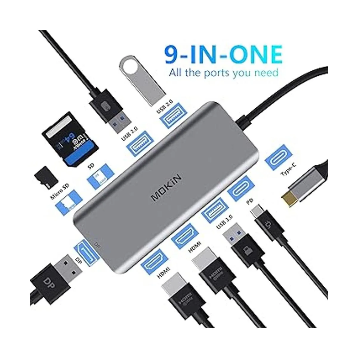 Estación de acoplamiento, adaptador USB C Dual HDMI, 9 en 1 Triple Display Multiport Adaptador Dongle con 2 HDMI 4K, DisplayPort, 3 USB, 100W PD, lector de tarjetas SDTF para MacBook Pro Air tipo C