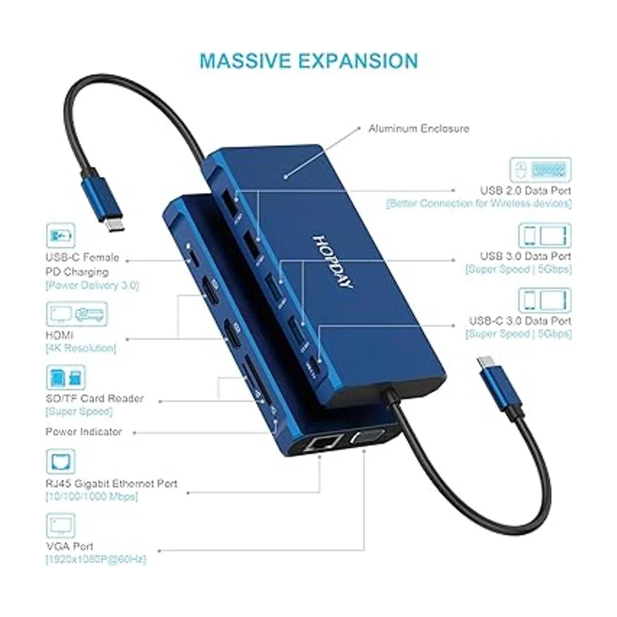 Estación de acoplamiento para laptop HOPDAY 12 en 1 pantalla triple Thunderbolt 3 USB C Hub adaptador multipuerto HDMI dual con VGAEthernetPD de 100 W USBC4 USBSDTF Dock para DellHPLenovoMacBook Pro