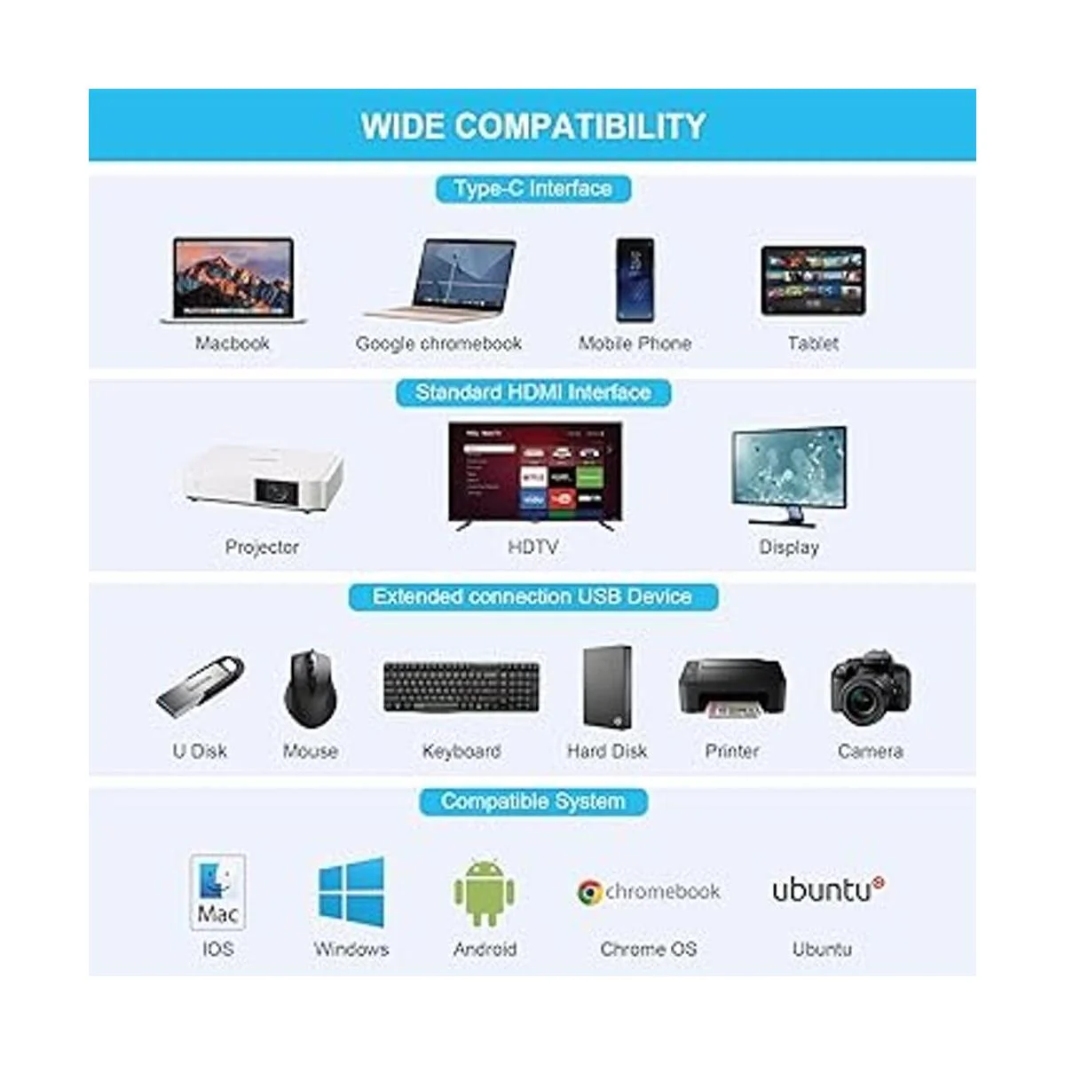 5 puertos USB y lector SD/TF: 1 puerto USB C, 2 puertos USB 3.0 con una velocidad de transferencia de datos de 5 Gbps y salida de potencia de 4.5 W 5 V/900 mA. Y 2 puertos USB 2.0 se utilizan mejor para tu mouse, teclado y otros dispositivos de baja velocidad. La ranura SD y TF integrada permite un fácil acceso a los archivos desde tarjetas de memoria SD y micro SD universales con una súper velocidad de hasta 5 GPB.