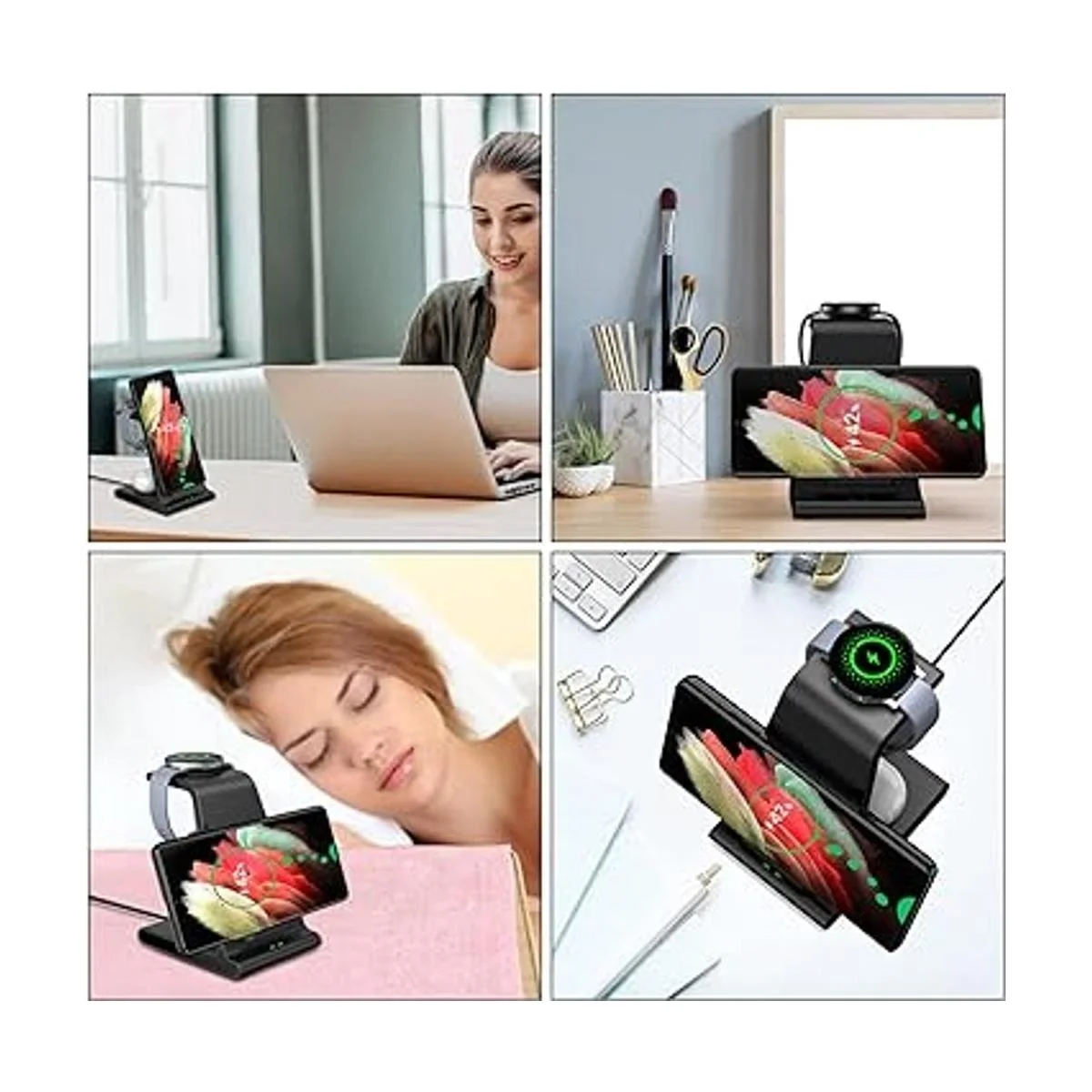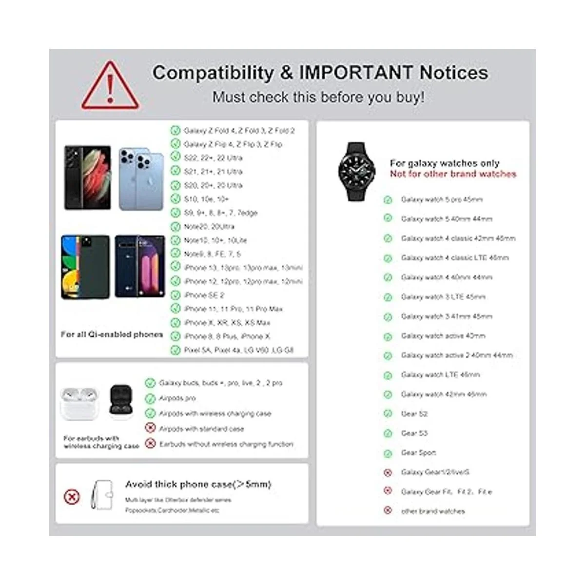 Compatible con múltiples dispositivos: el soporte de carga 3 en 1 es compatible con Samsung Galaxy Z Fold 2/Z Fold 3/Z Fold 4/Z Flip/Z Flip 3/Z Flip 4/S22/S22/S22 Ultra/S21/S21/S21 Ultra/S20/S20/S20 Ultra, Note 20, etc. El soporte de cargador inalámbrico es adecuado para iPhone 13/13 Pro/13 Pro Max/12/12 Pro/12 Pro Max/XS Max/XR, etc., para Samsung Galaxy Watch 5 Pro/5/4/Watch 4 Classic/Watch/Watch 3/Watch Active/Watch Active 2/Gear S4 no para i WATCH, para Air Pods Pro/3, para Samsung Galaxy Buds 2 Pro/Buds Pro.