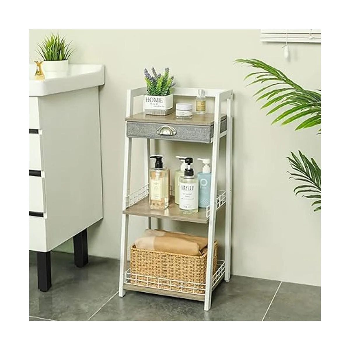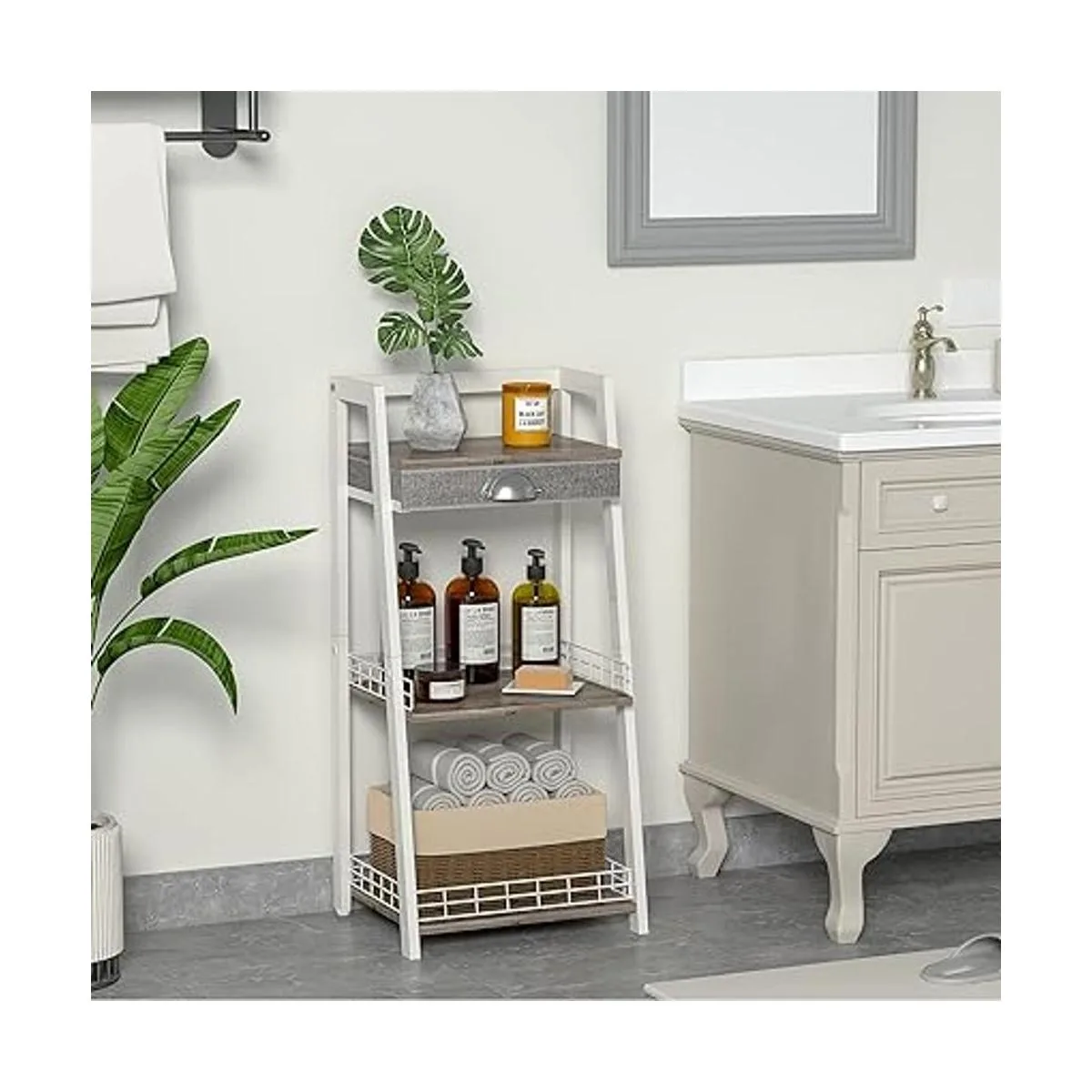Estante de escalera de baño de 3 niveles, estante de almacenamiento de piso de baño con cajón, estante de torre independiente, unidad de estantería abierta para baño, sala de estar, balcón blanco