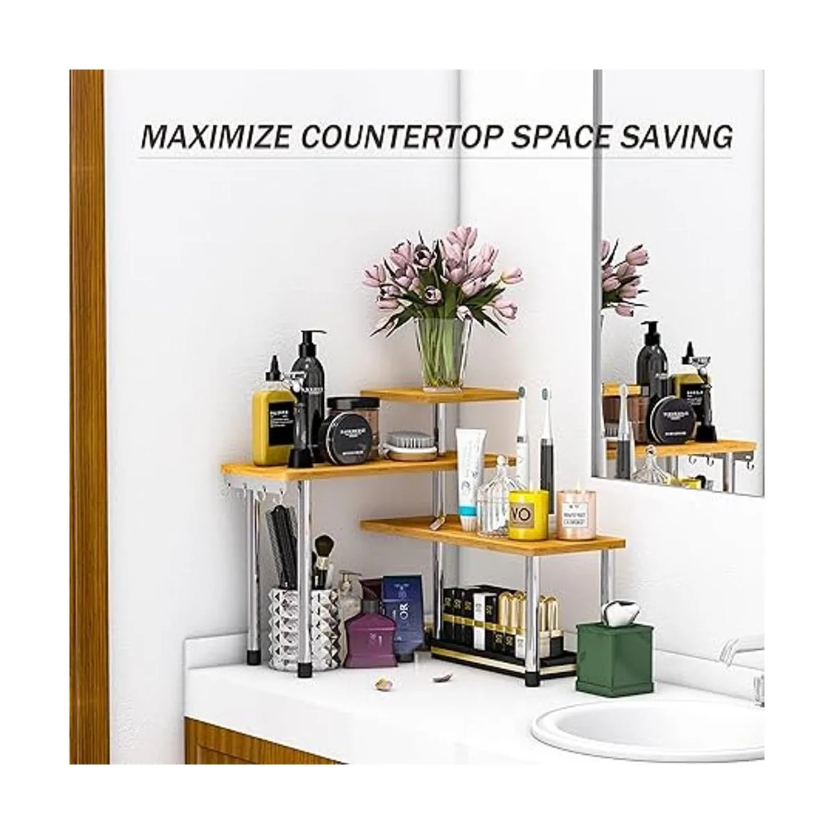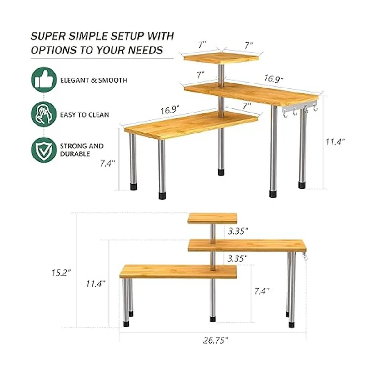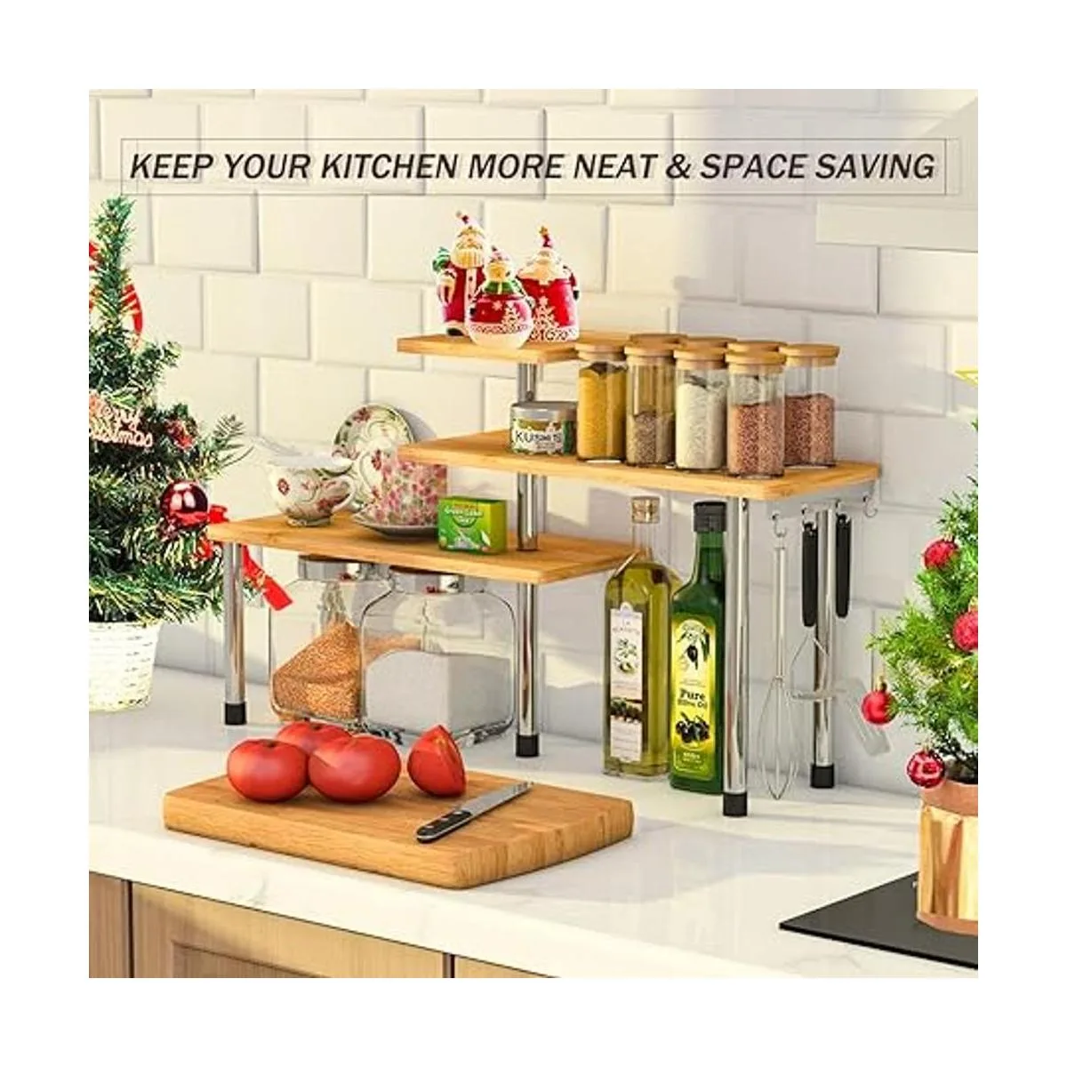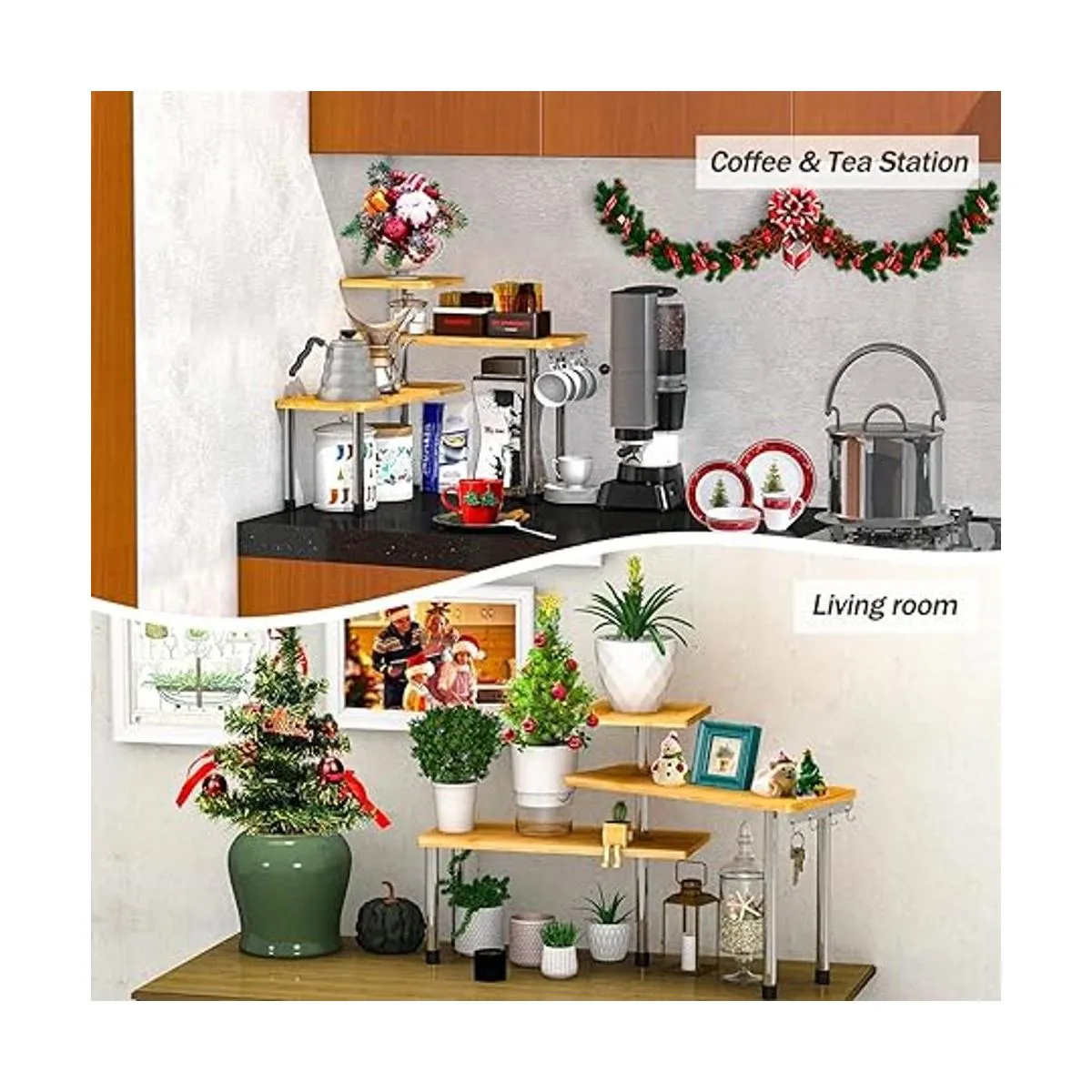 Estante de esquina organizador para encimera de cocina, de bambú, con 3 niveles de almacenamiento para baño, especias, escritorio, estantería, con ganchos