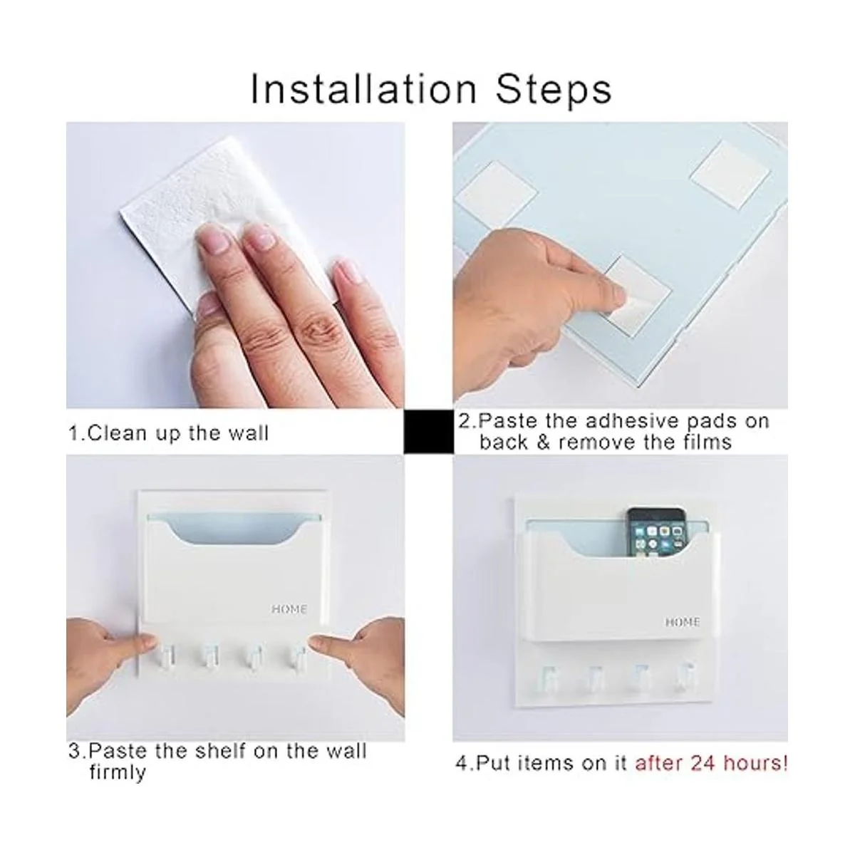 4 almohadillas adhesivas de doble cara para una fácil instalación en pocos segundos, incluso los niños pueden hacerlo. Sin herramientas, sin daños en la pared no se puede pegar en la pared del parer u otra pared fácil de arrancar; te sugerimos encarecidamente que pongas cosas en él 24 horas después de terminar la instalación para un mejor rendimiento de carga de peso más largo