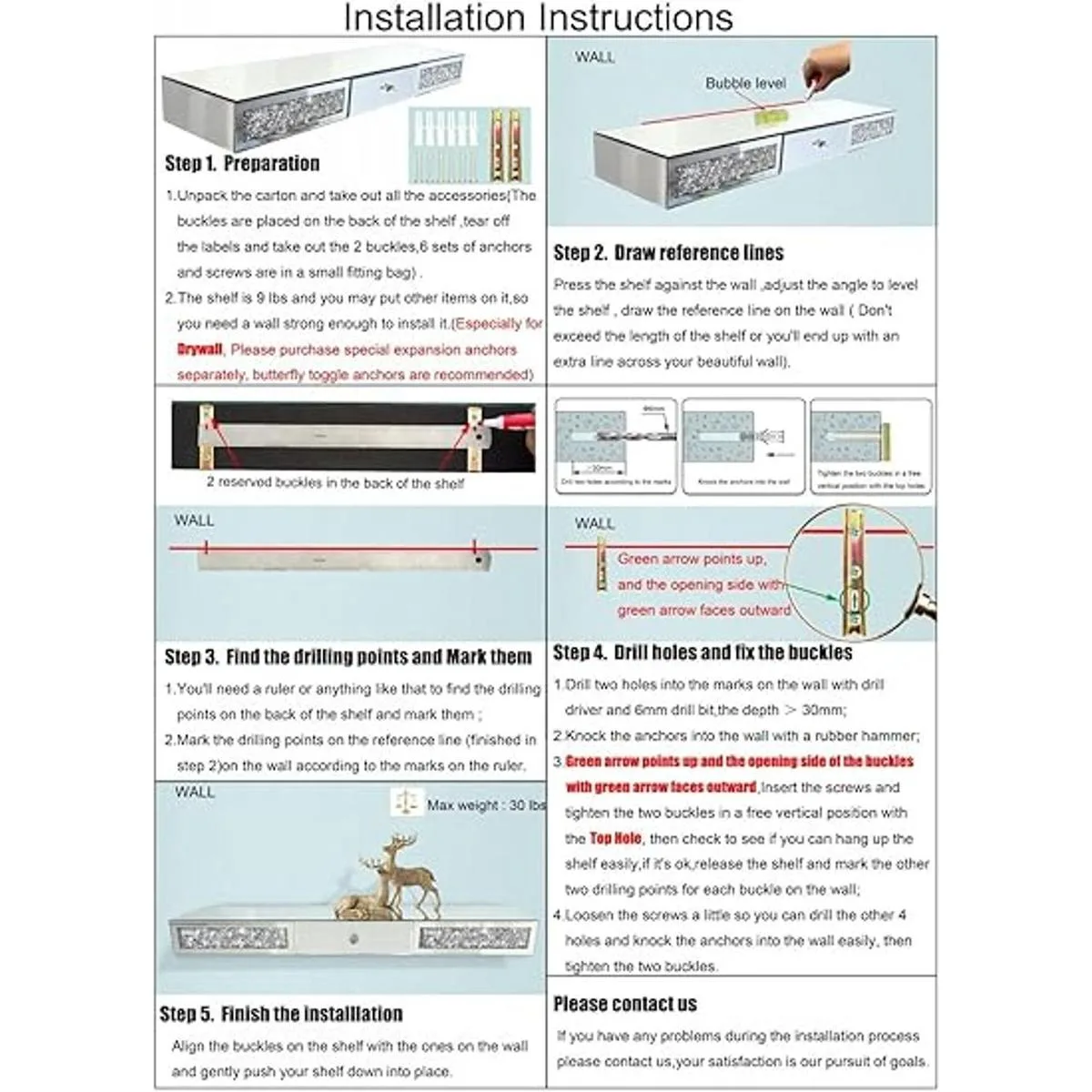 Dimensiones: 31.5 pulgadas de largo x 7.9 pulgadas de ancho x 3.1 pulgadas de alto, todos los accesorios están incluidos, el hardware se fija en la parte posterior del estante del espejo, las instrucciones de instalación en la última imagen te guiarán a través del proceso de instalación debido a que es inherentemente pesado y puedes poner otros artículos en él, por lo que no recomendamos instalarlo en paredes de materiales suaves.