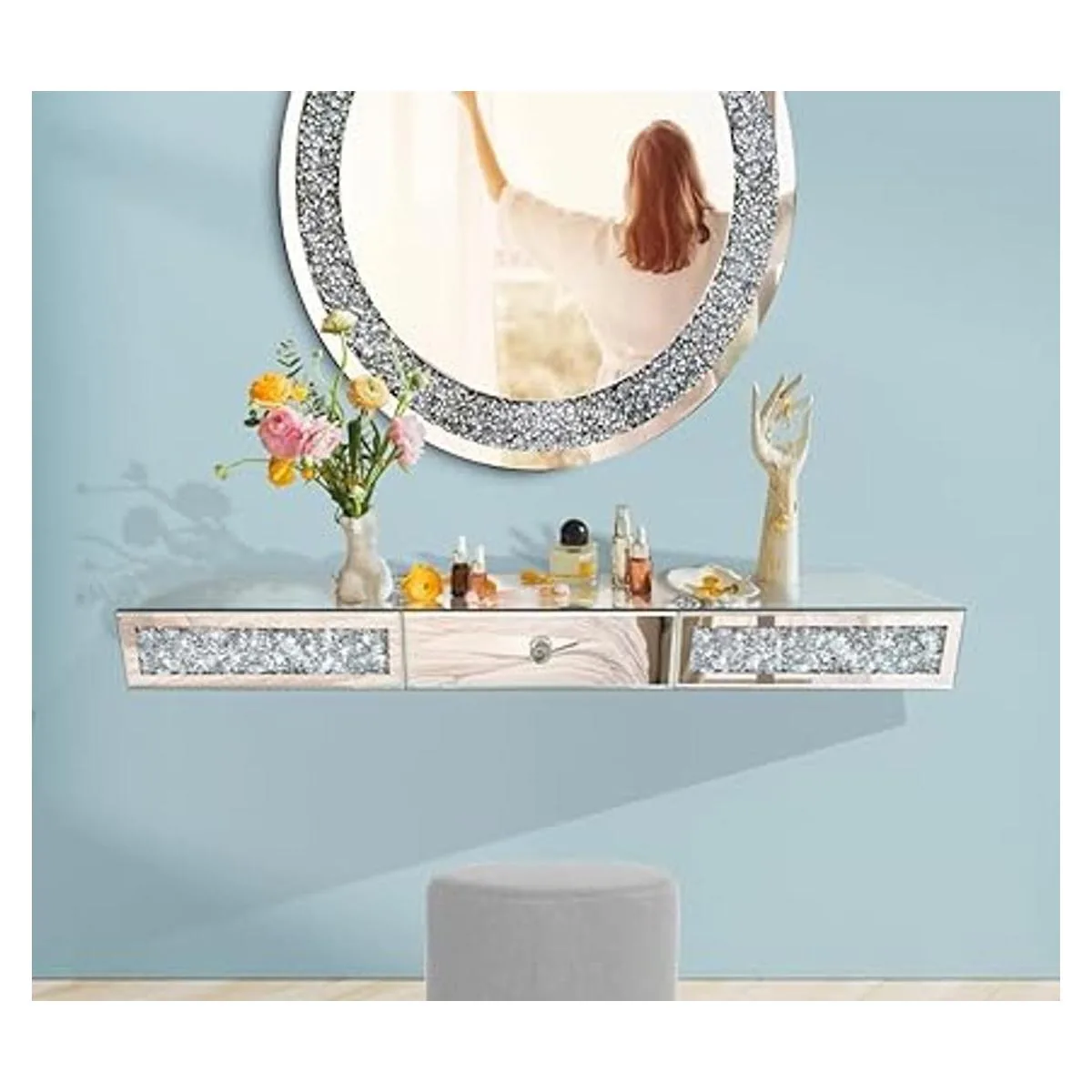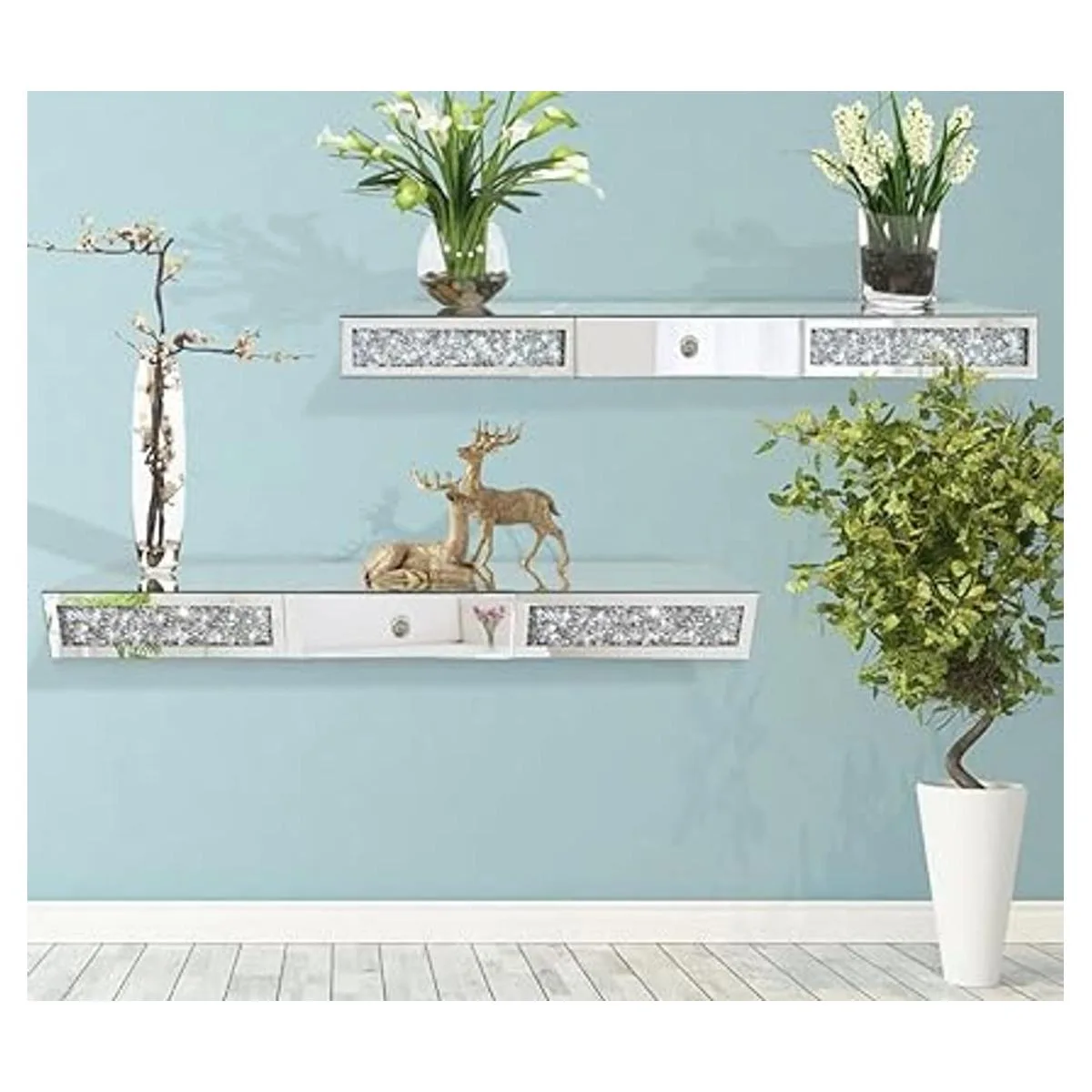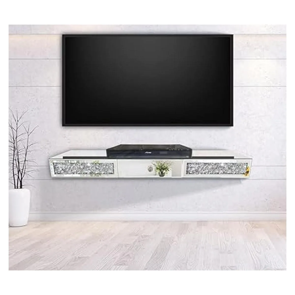 Estante de pared con espejo para muebles con cajón, vitrina flotante de diamantes de cristal, mesa decorativa de espejo plateado con diamante triturado, hermoso juego de TV brillante, decoración artística de pared, 31.5 pulgadas de largo x 7.9 pulgadas de ancho x 3.1 pulgadas de alto