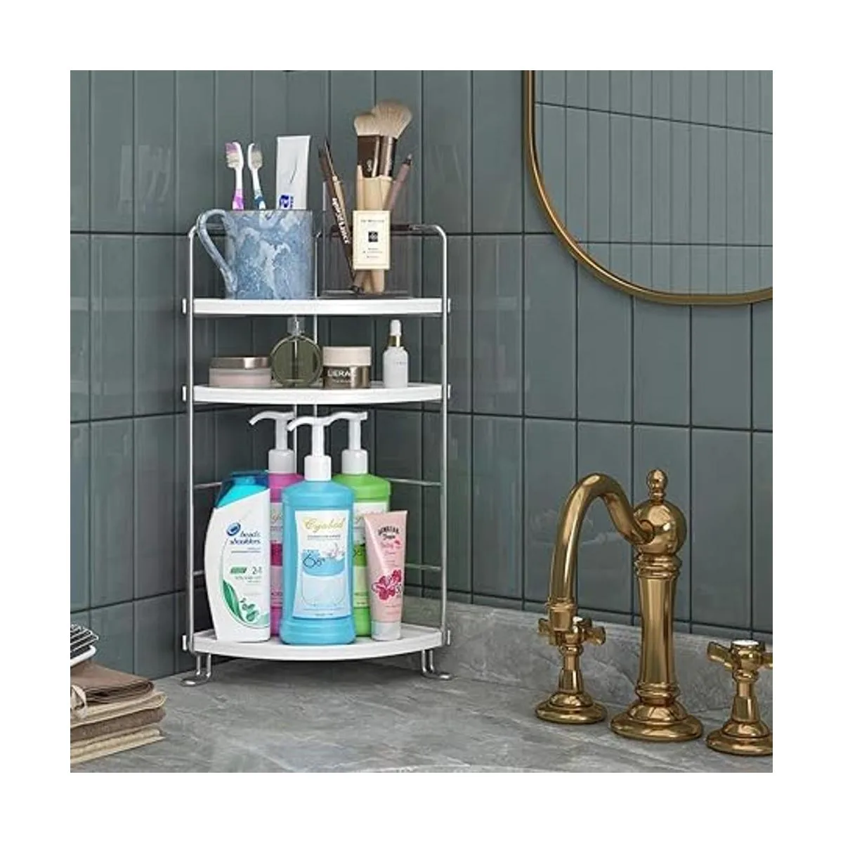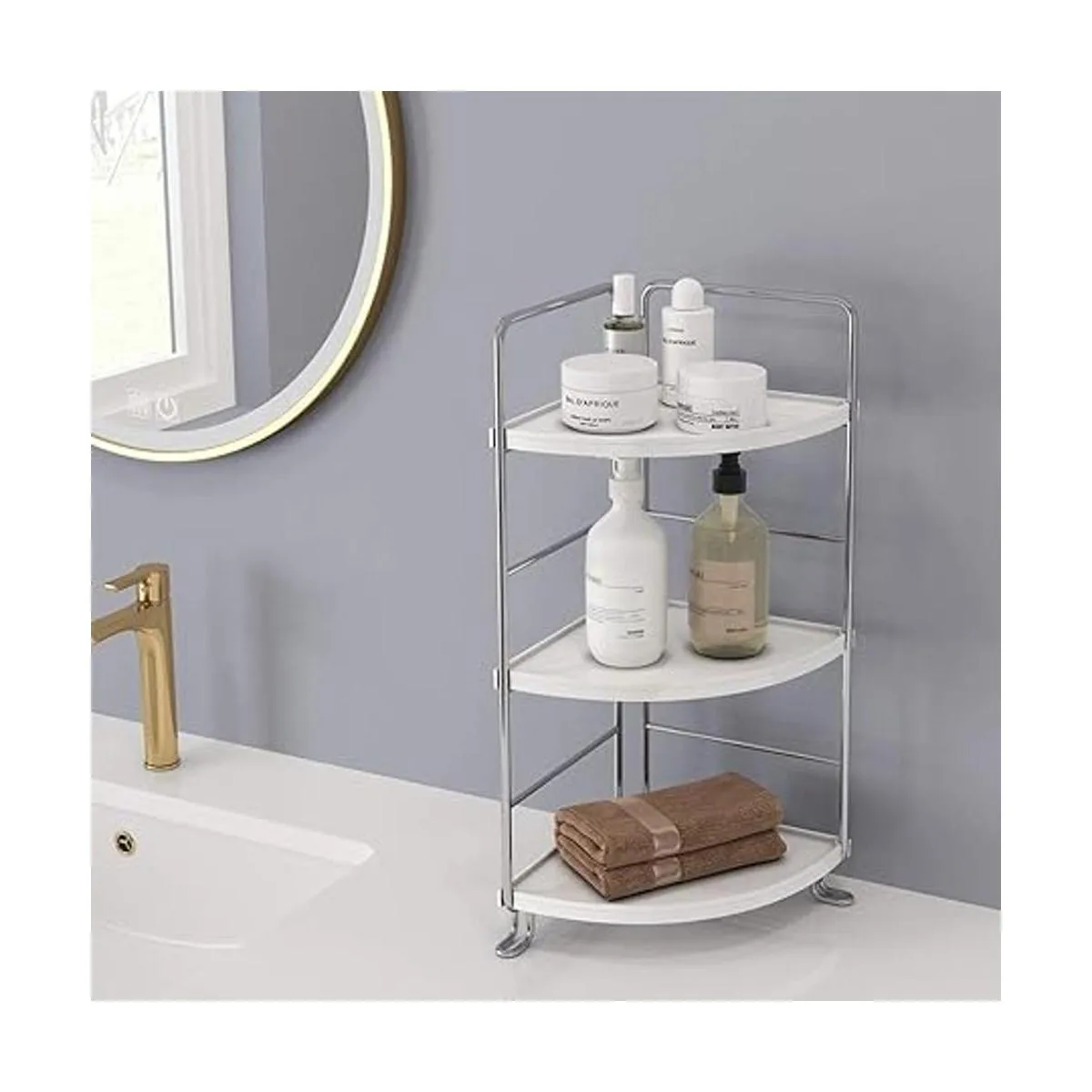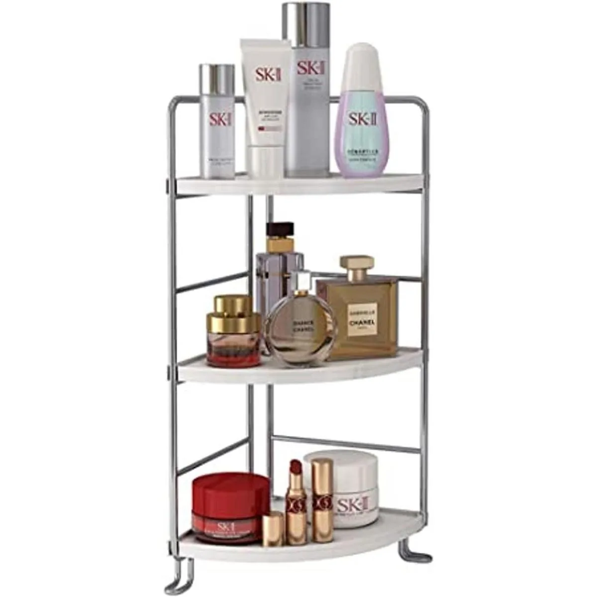 Estante esquinero de 3 niveles para especias de cocina, baño, bandeja de tocador para almacenamiento de maquillaje, estante de pie, color plateado