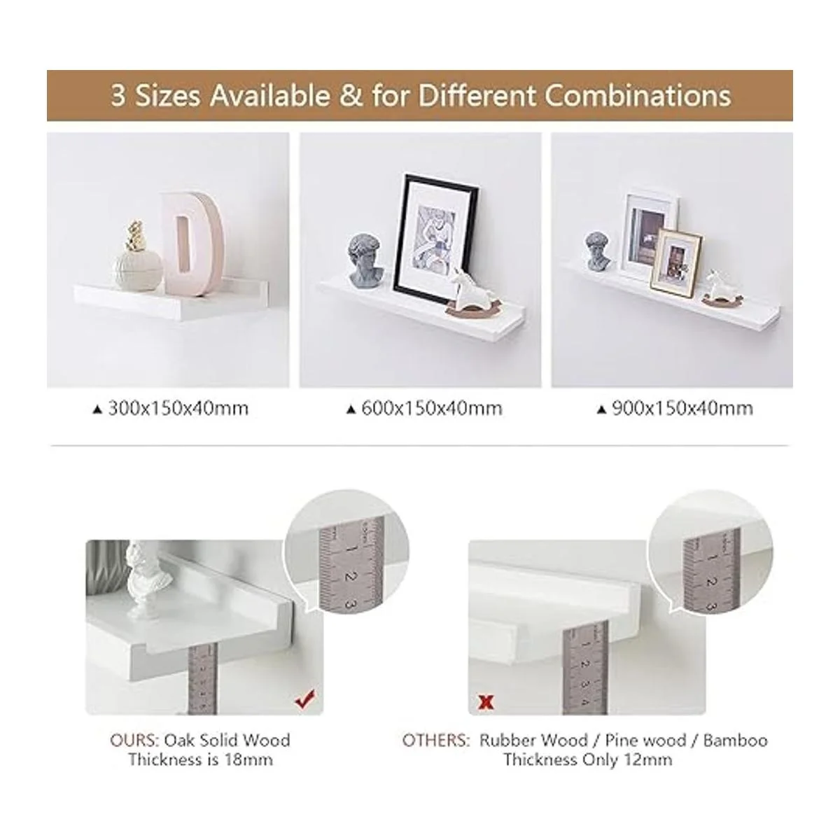 Mantén los artículos en su lugar: nuestro estante flotante de roble te ayudará a ahorrar espacio, por lo que puedes utilizar para mostrar decoraciones, imágenes, plantas; o ordenar tarros, botellas, artículos de baño, etc. en el baño, dormitorio, cocina, sala de estar. Y el diseño de borde frontal en el estante puede evitar que los artículos se caigan o se deslicen hacia adelante.
