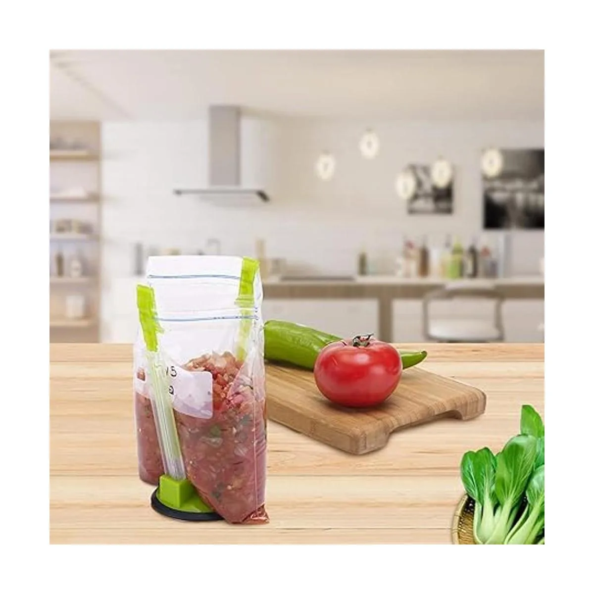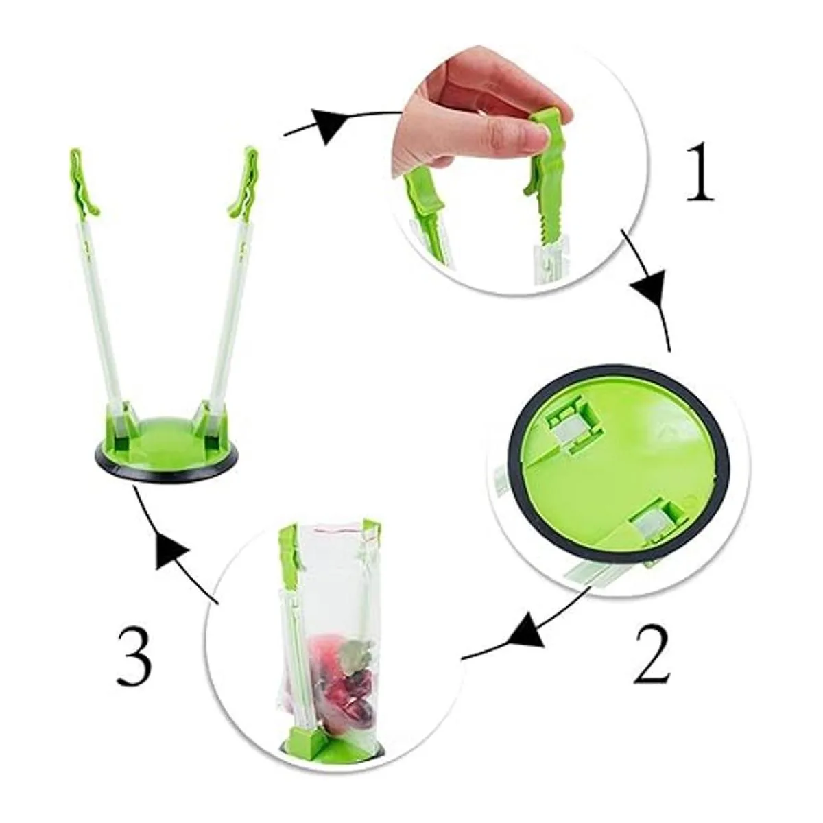 Simplemente sujeta la bolsa de alimentos debajo de los clips y llena, permite la comodidad manos libres para llenar bolsas con alimentos, es como tener un juego extra de manos en la cocina. Nunca te preocupes por derramar alimentos mientras lo pones en tu bolsa de almacenamiento.