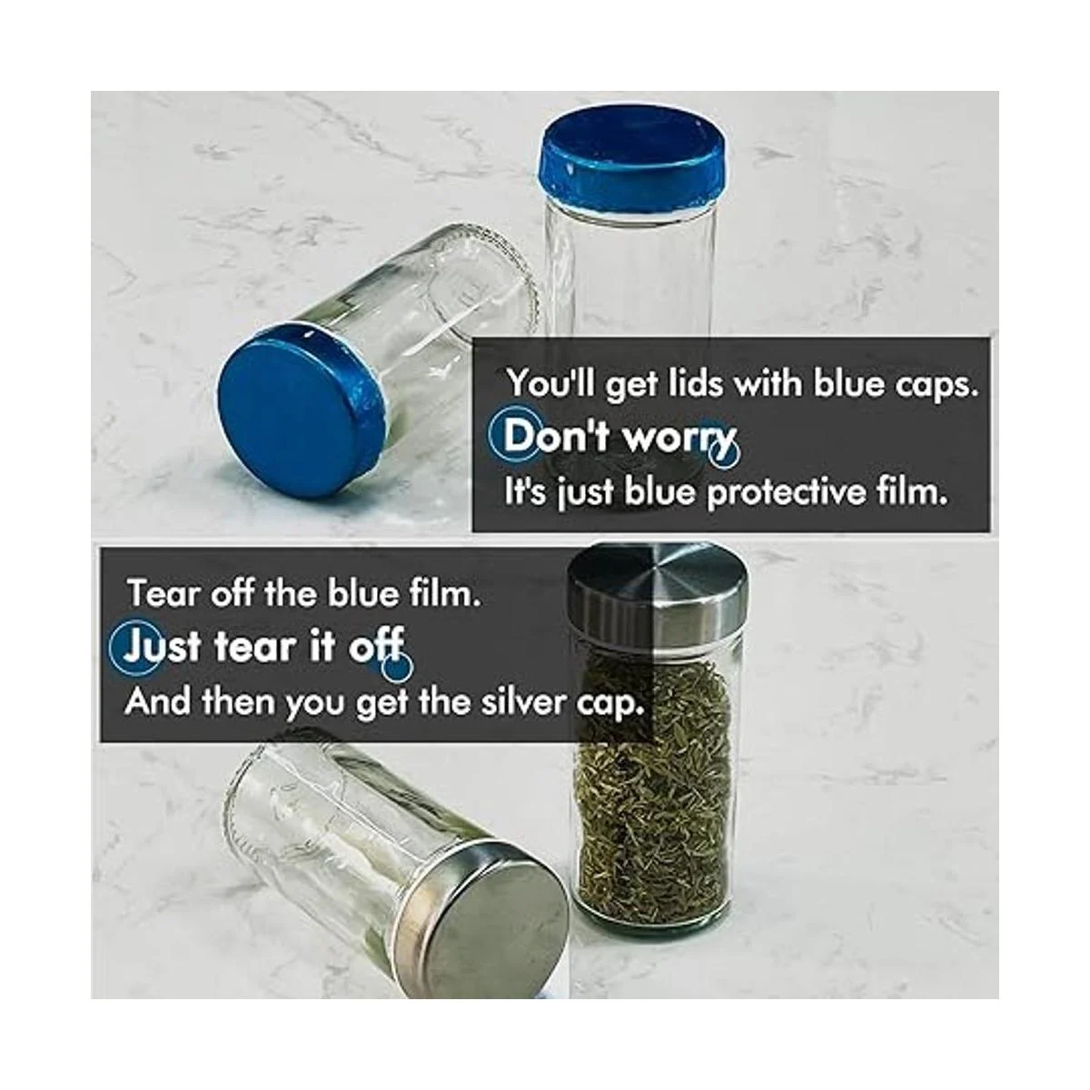 Material seguro de alta calidad: los tarros de vidrio resistentes para botellas de especias son de material de grado alimenticio. Para evitar que las tapas se rayen, está sellado con película protectora de plástico azul. Es mejor que los quites. Con un borde de acero inoxidable, puedes girar la tapa para usar, o puedes cerrarla para mantener tus especias frescas.