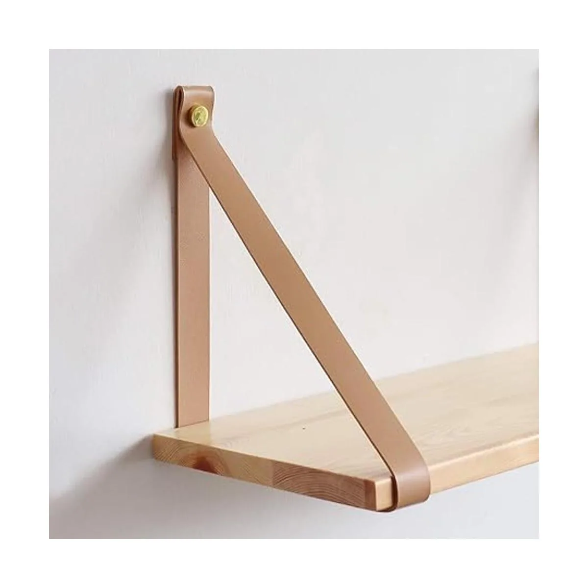 Materiales: cuero artificial 1.0 in de ancho, 0.1 in de grosor, 30.0 in de largo, tablero de pino barnizado 8.0 in de ancho, 0.8 in de grosor, 17.0 in de largo, accesorios de montaje de latón incluidos para fijarlo a la pared