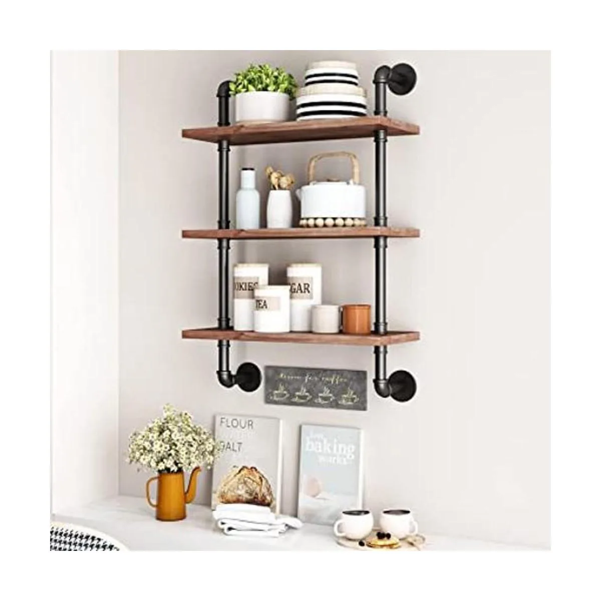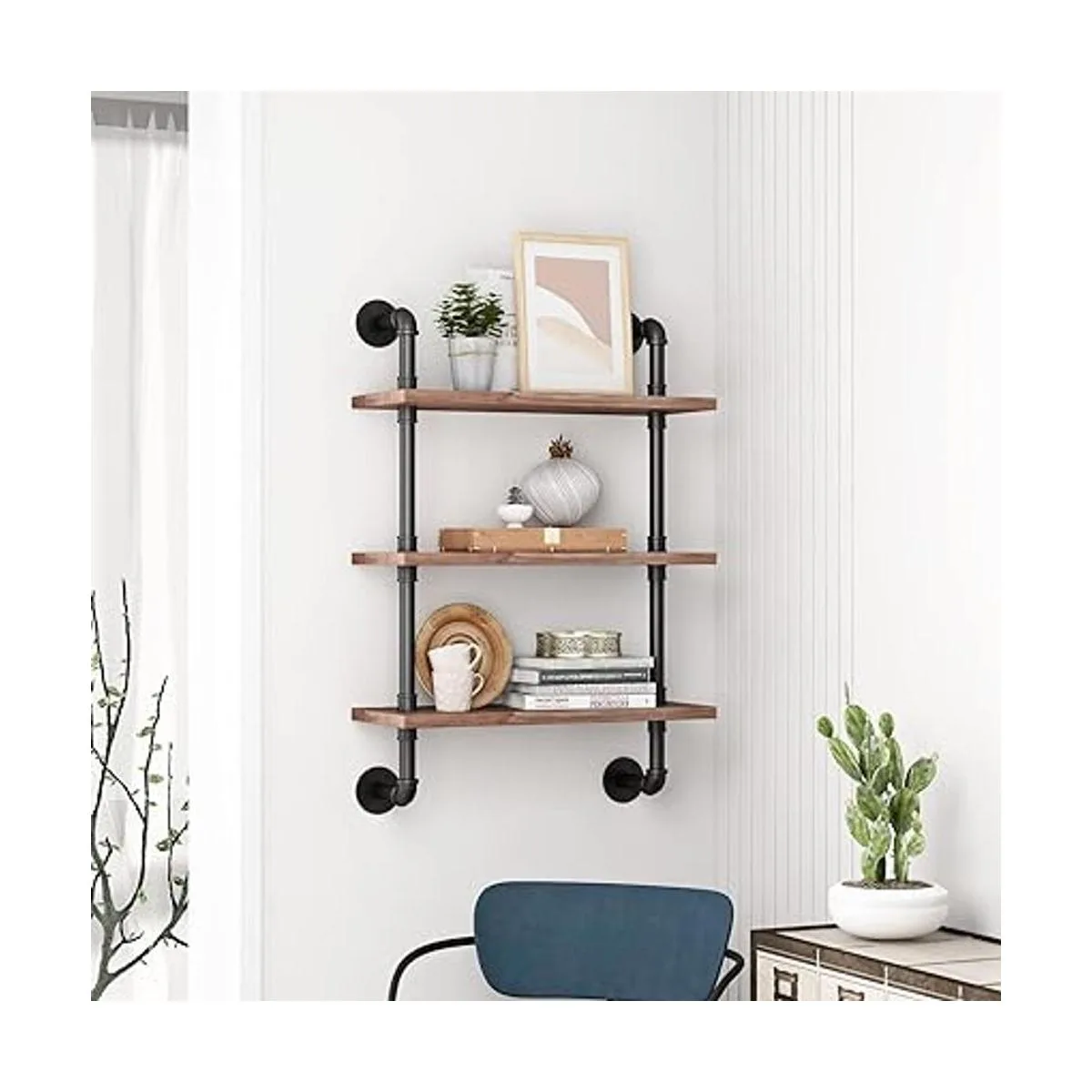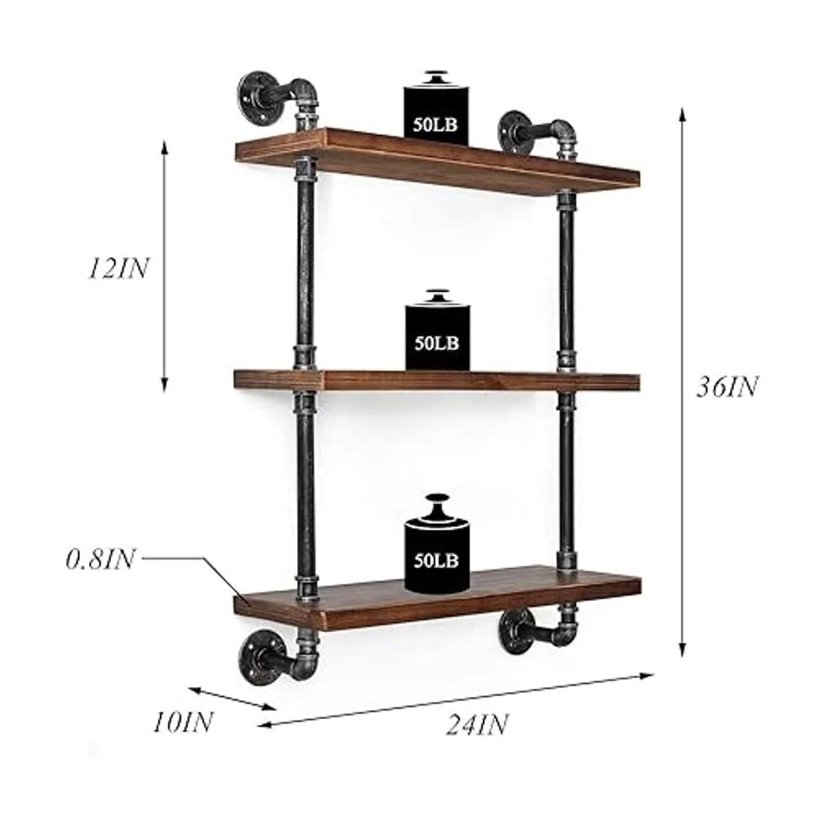 Estantería industrial para tubos de madera rústica, estantes flotantes de 3 niveles, estantería moderna para montaje en pared negro, 24 pulgadas