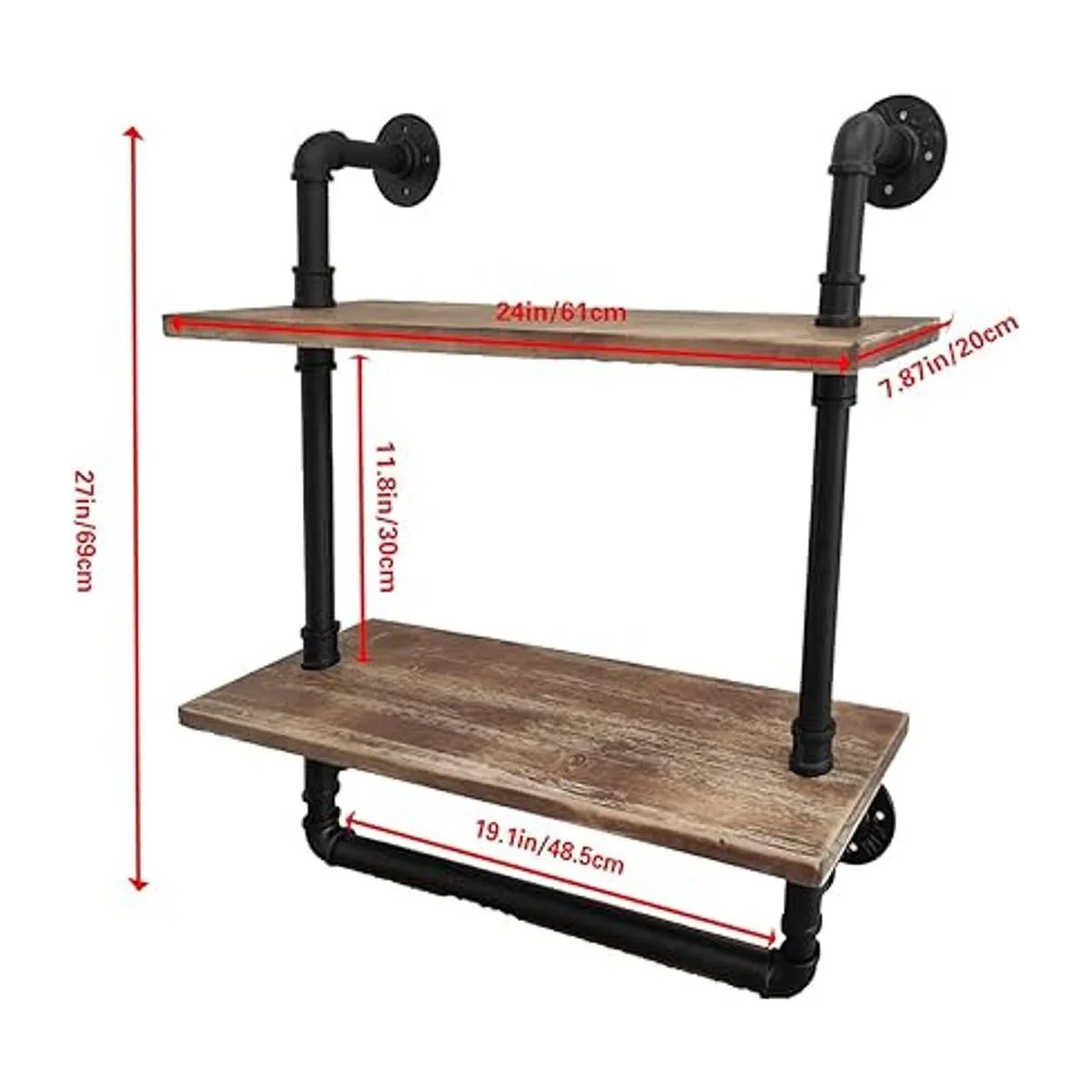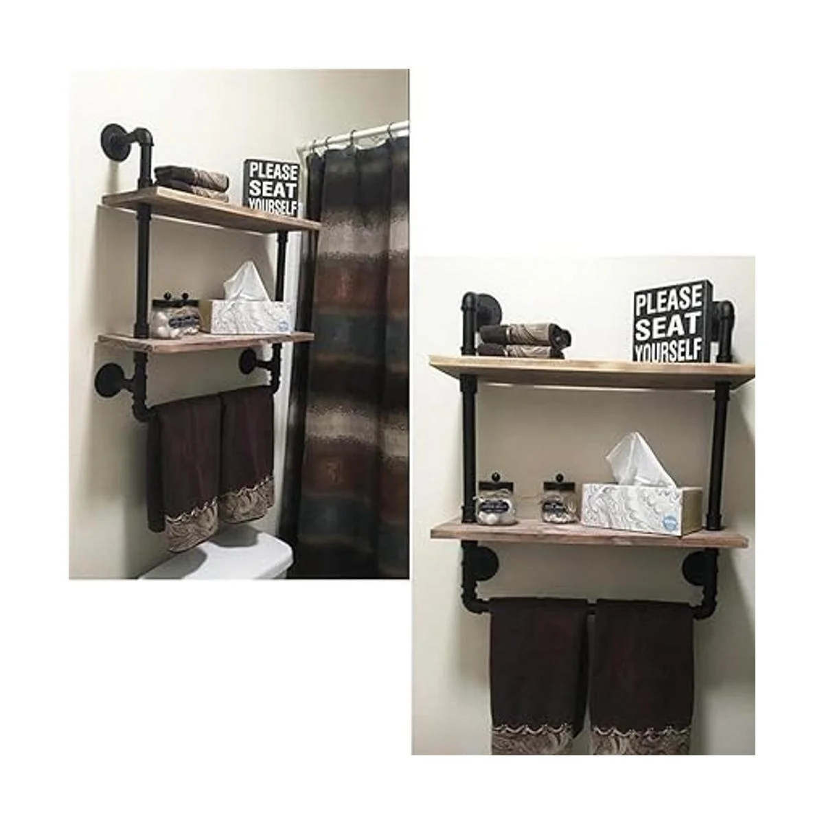 Estantes de baño industriales montados en la pared, 2 niveles, estante de madera de 23.6 in con barra de toalla, toallero rústico de granja, estantes flotantes de metal, estante de hierro envejecido sobre el inodoro