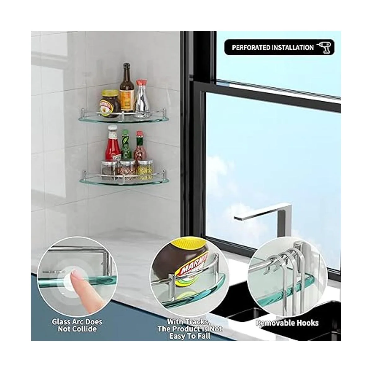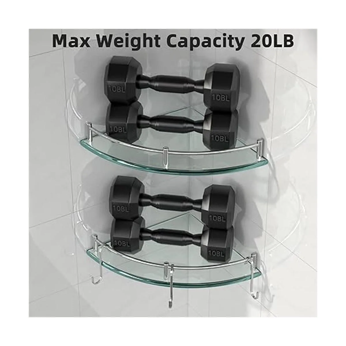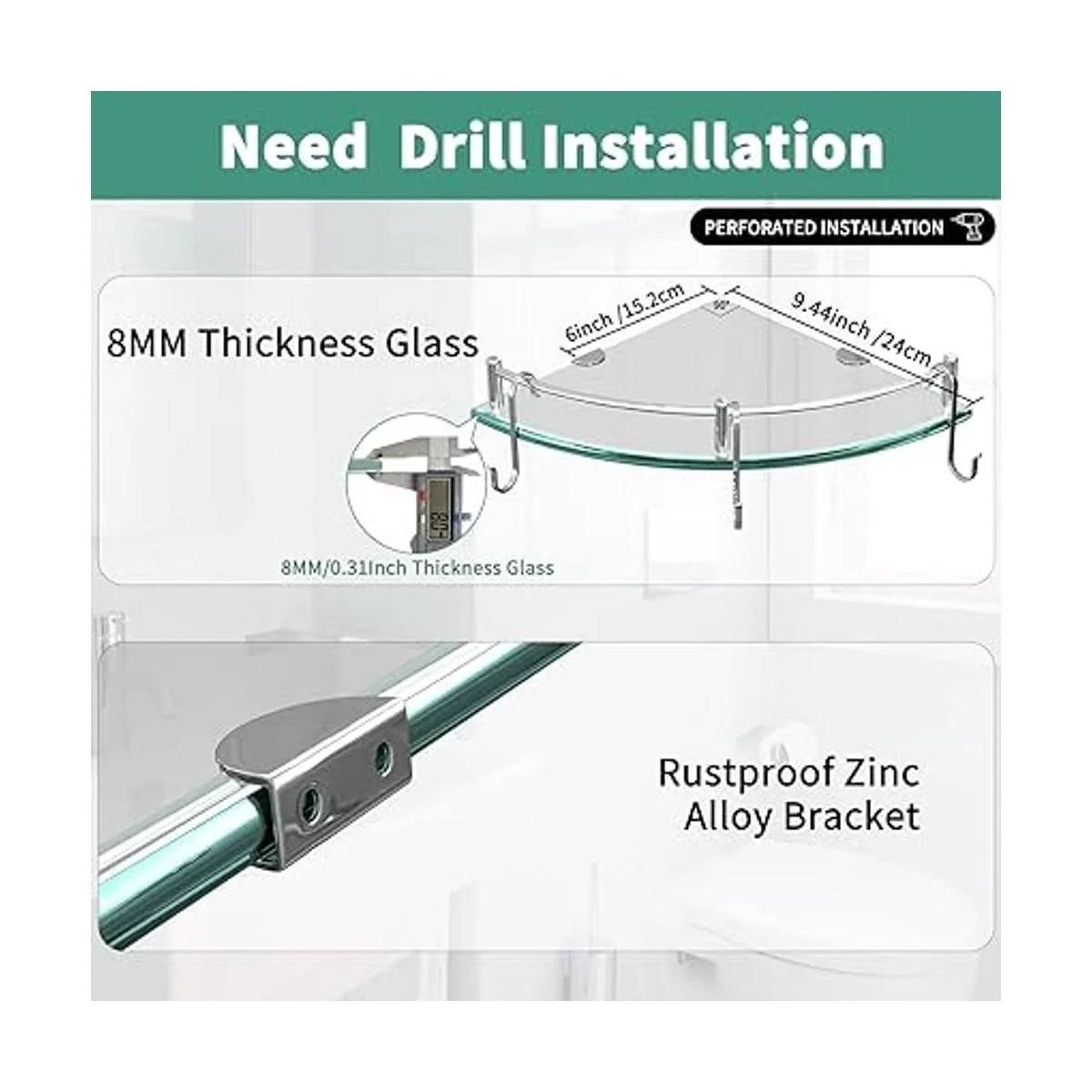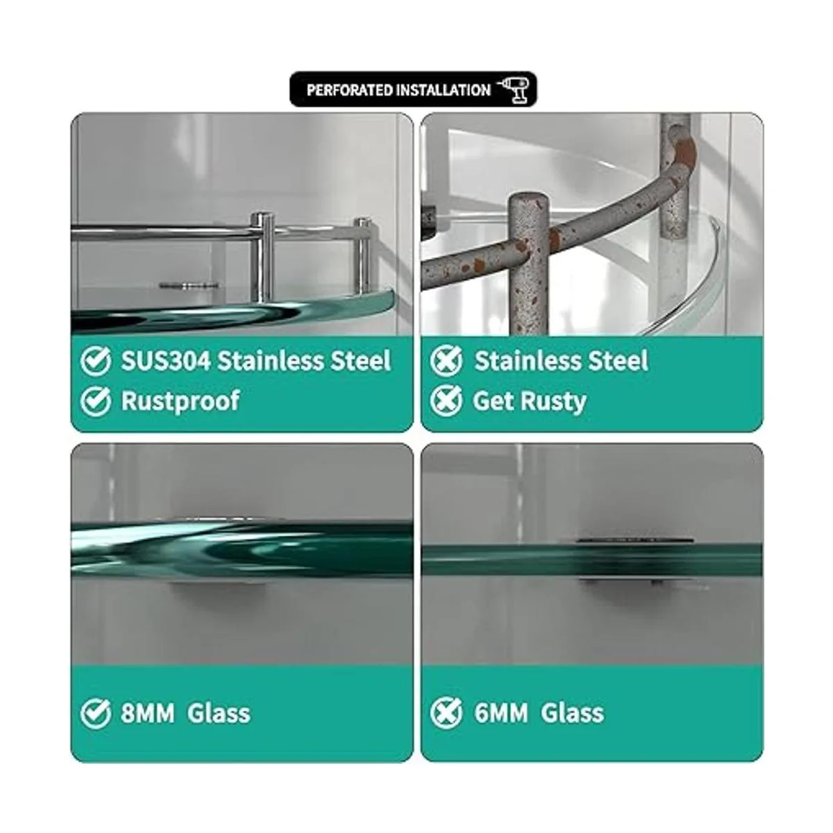 Estantes de ducha de cristal duraderos con riel: hechos de estante de esquina de vidrio templado extra grueso de 0.3 pulgadas y soportes de aleación de zinc. Los estantes de baño son fáciles de limpiar, su soporte de acero inoxidable y riel de acabado cromado pulido garantizan la coestructura de alta calidad y excelente resistencia, este estante esquinero con riel protege tus productos de caídas del estante fácilmente.
