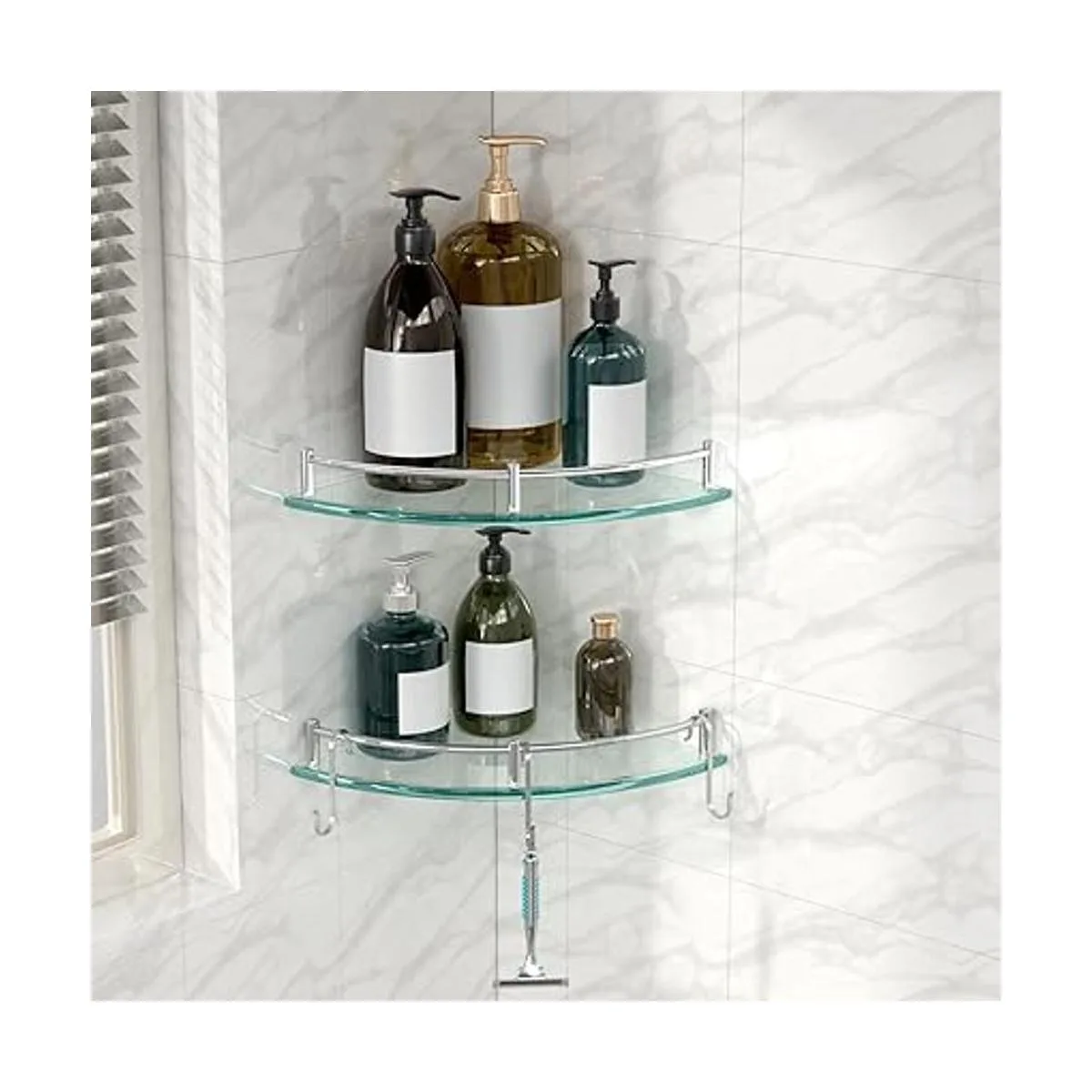 Estantes de cristal, estante de esquina de ducha, estante de cristal montado en la pared, estante de cristal para baño, organizador de champú, estantes de esquina de vidrio extra de 0.315 in de grosor, para ducha interior con 3 ganchos
