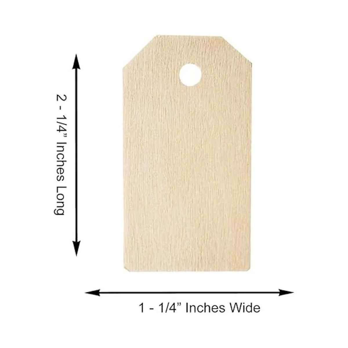 Las etiquetas miden 2 1/4 pulgadas de largo x 1 1/4 pulgadas de ancho. El paquete viene con 50 etiquetas de madera en blanco. Cada uno tiene un corte de perforación en la parte superior para añadir fácilmente colocaciones de cuerdas o ganchos en S.