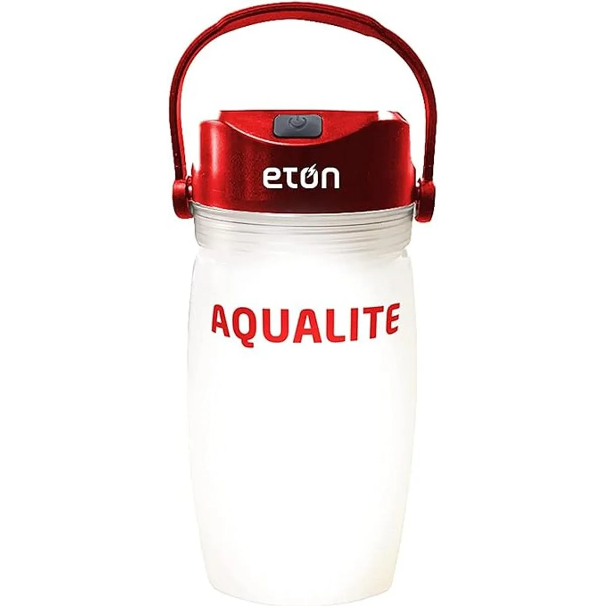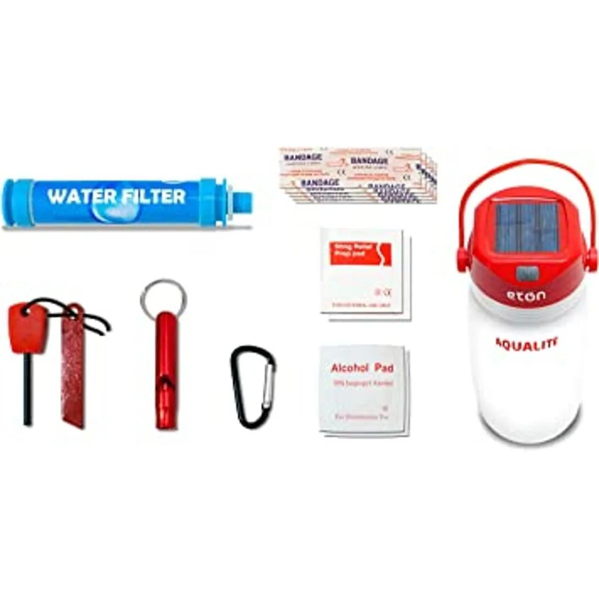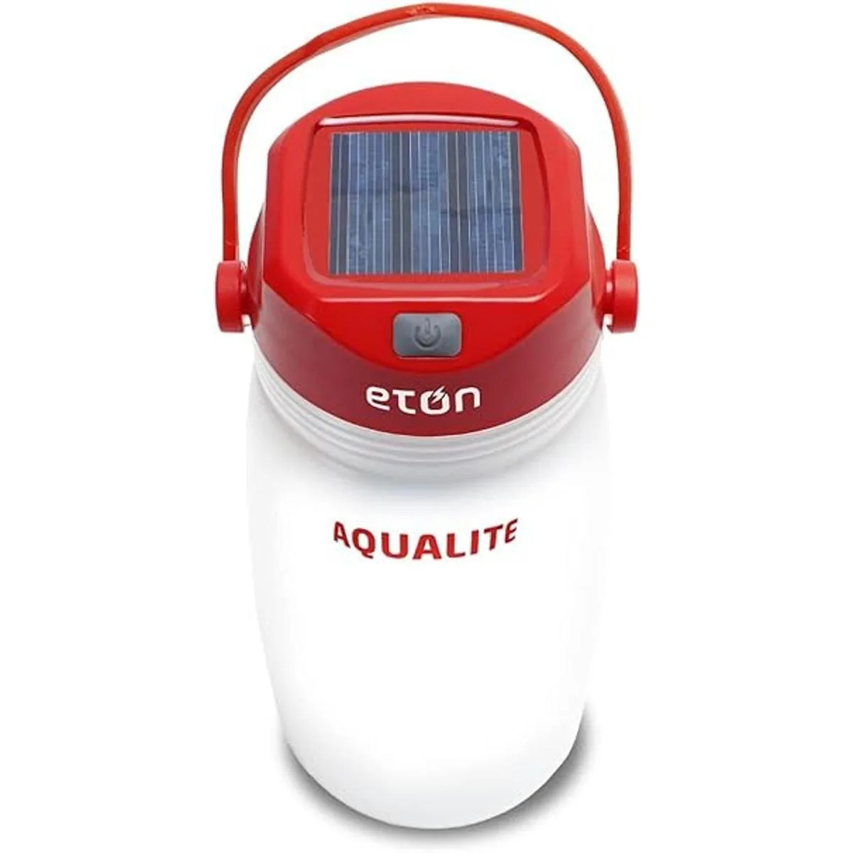 Eton Linterna solar Aqualite con botella de agua integrada, kit de supervivencia de emergencia, silicona plegable, cargador de teléfono, arrancador de fuego de pedernal, silbato de emergencia, luz SOS