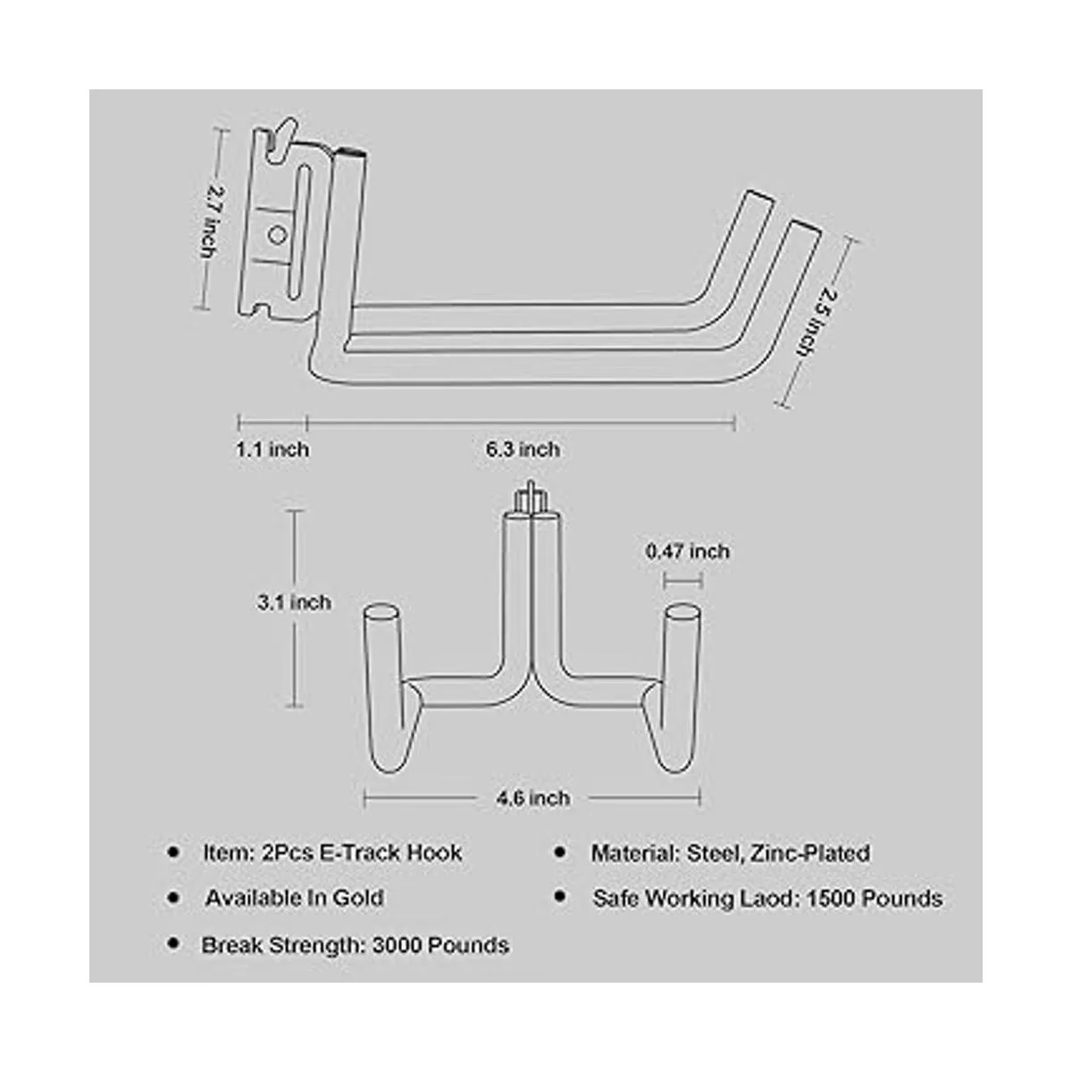 Medidas: el amarre ETrack es de 7.5 pulgadas de largo con un gancho de 4.5 pulgadas de alto para colgar todos los accesorios de remolque