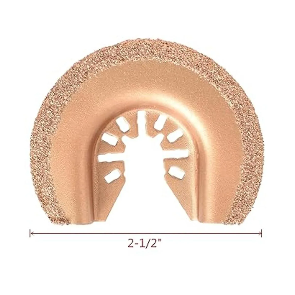 Cuchillas semicirculares de 21/2 pulgadas: la hoja semicircular oscilante de grano de carburo de ajuste universal te permite cortar en juntas de hormigón y azulejos defectuosos con su grano de carburo soldado.