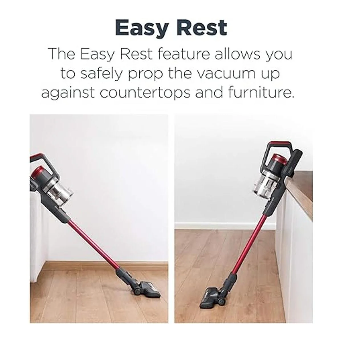 Función de descanso fácil: Necesitas tomar un descanso El soporte Easy Rest especialmente diseñado, te permite apoyar la aspiradora de forma segura en encimeras y muebles