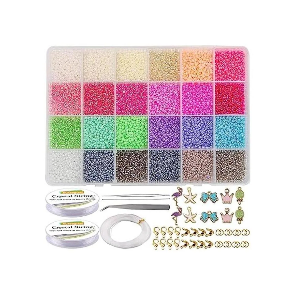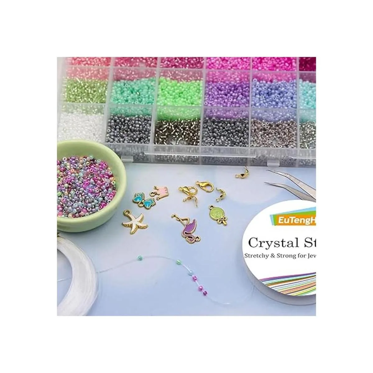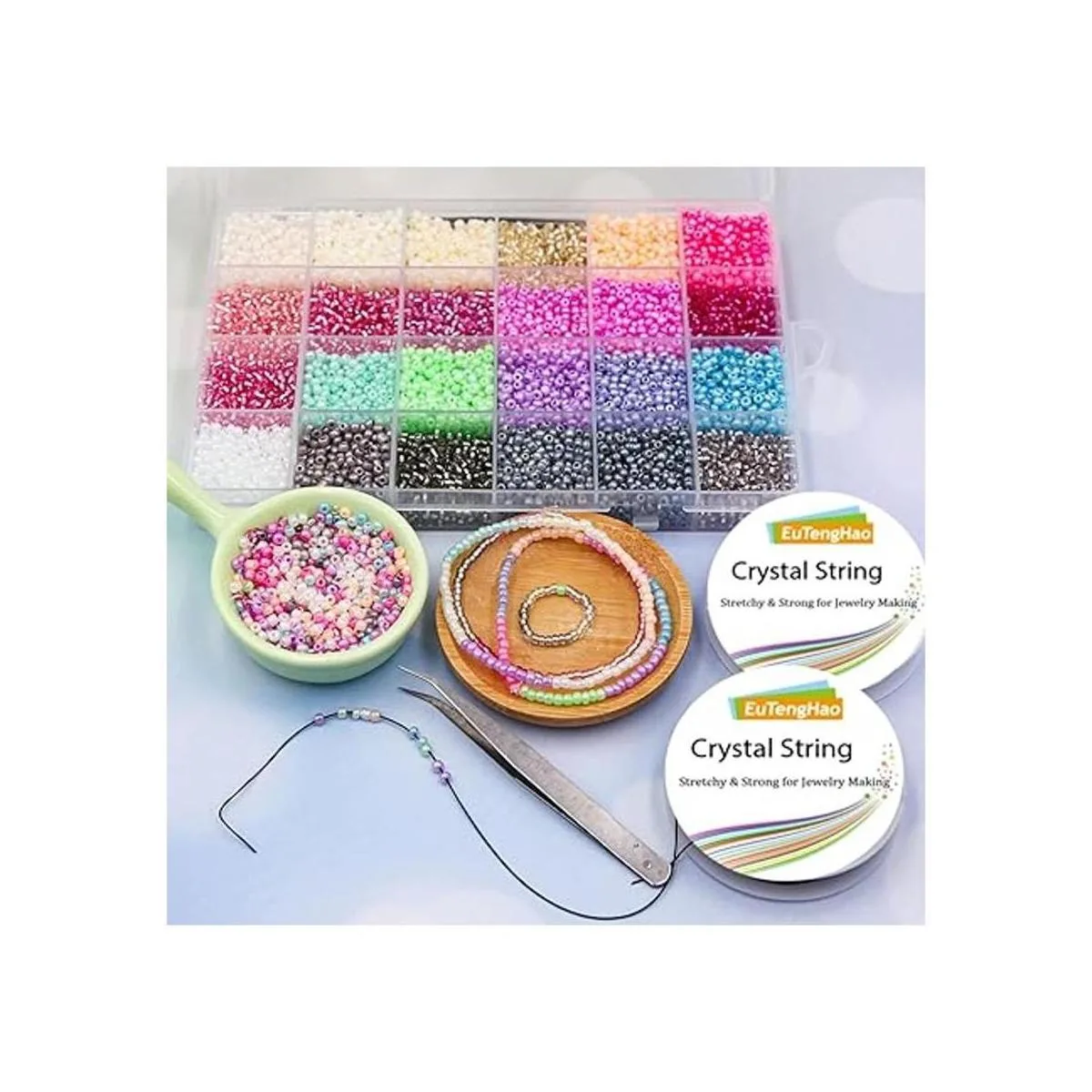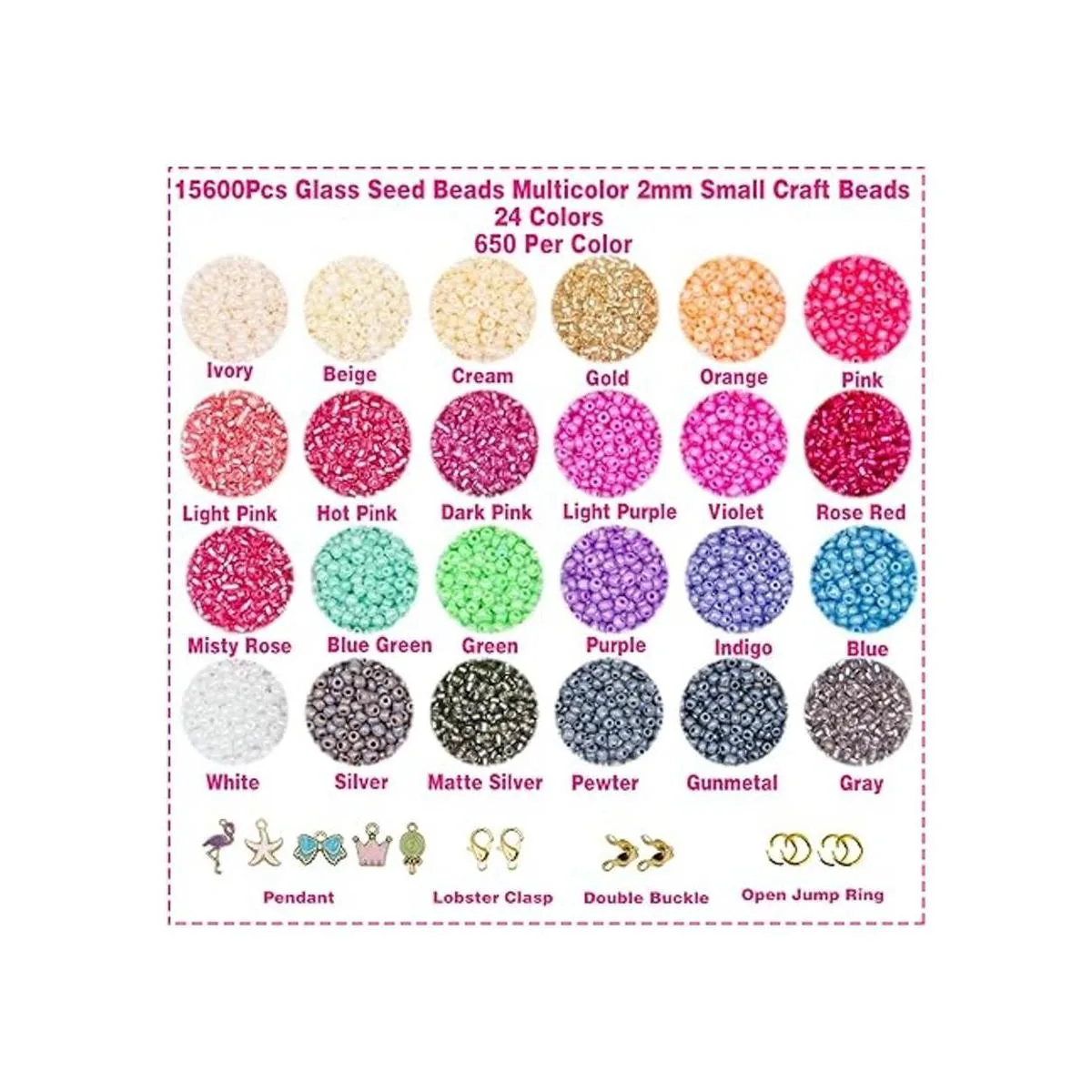 EUTENGHAO Kit de cuentas de semillas: el paquete contiene 15600 piezas de coloridas cuentas de semillas de 0.079 in. El kit también contiene 5 abalorios, 5 cierres de langosta, 10 cubiertas de nudo de punta de cuentas, 20 anillos abiertos, 1 hilo de pesca, 2 cuerdas elásticas, 2 agujas y 1 pinza.