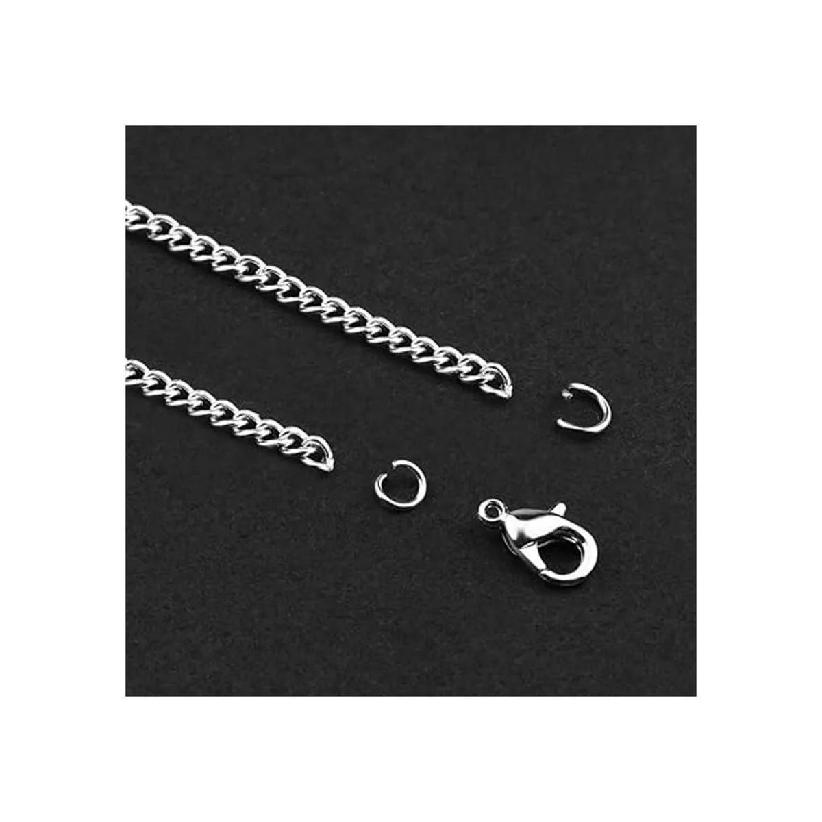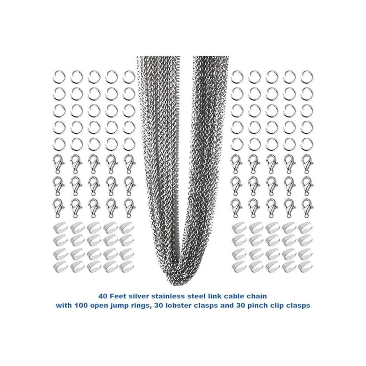El paquete incluye cadena de joyería de 40 pies 0.059 in, 30 cierres de mosquetón 0.472 in, 100 anillos abiertos 0.157 in y 30 cierres de clip en color plateado. El paquete también contiene 5 cordones encerados negros.