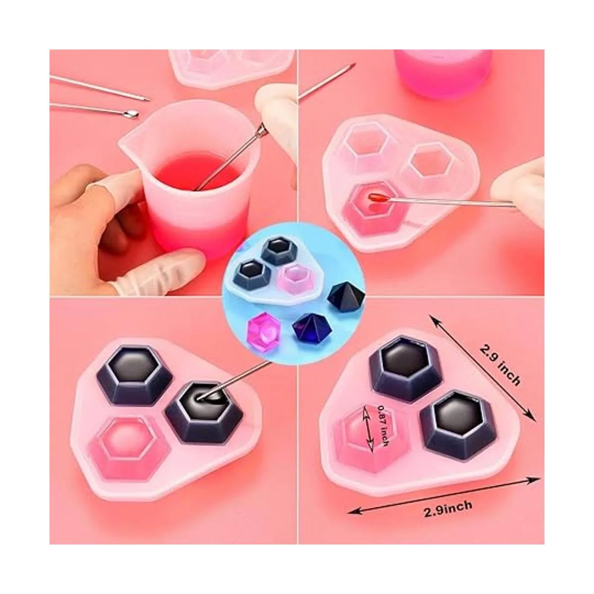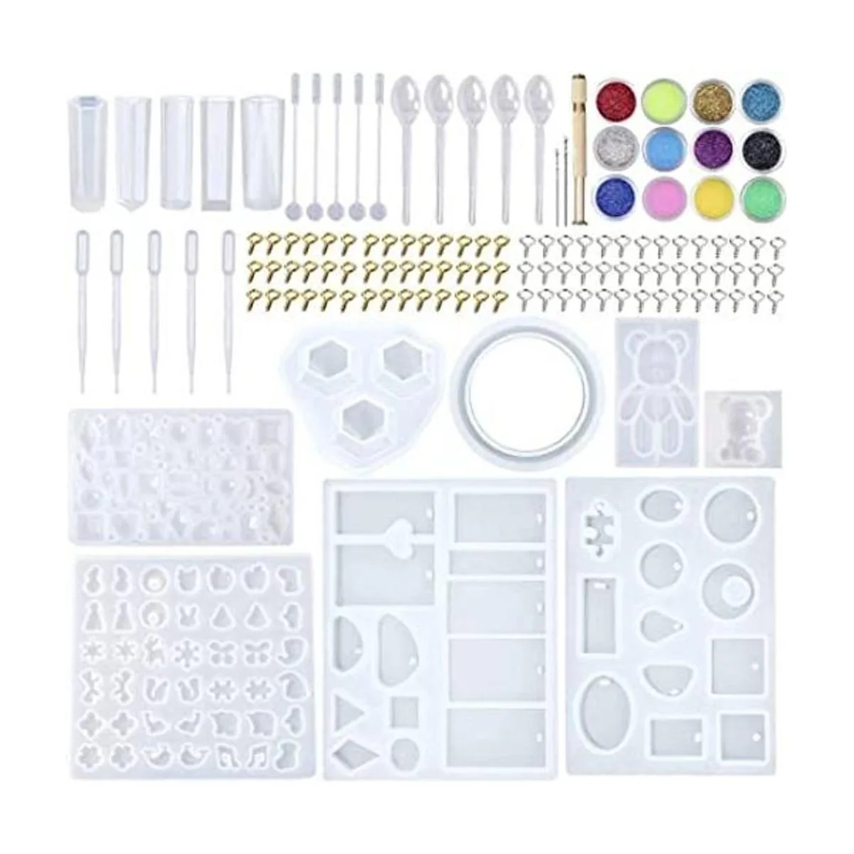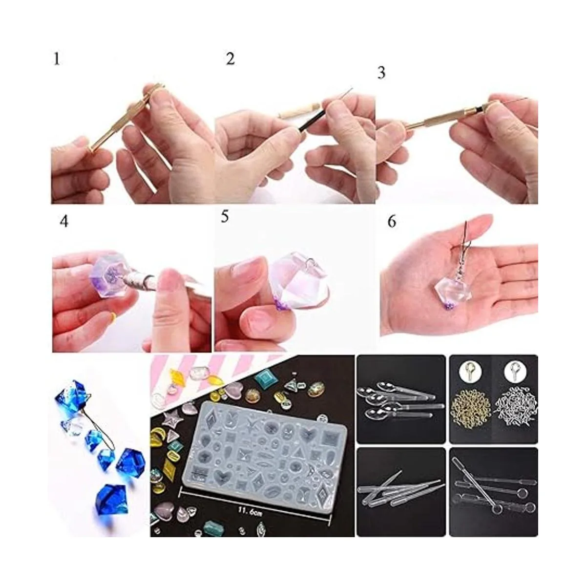 Moldes de joyería Solicone de alta calidad, material de silicona, que es flexible y suave. Los pasadores de ojo de tornillo están hechos de aleación de metal, agitadores, cuentagotas y cucharas están hechos de plástico de calidad, el taladro giratorio a mano está hecho de acero inoxidable.