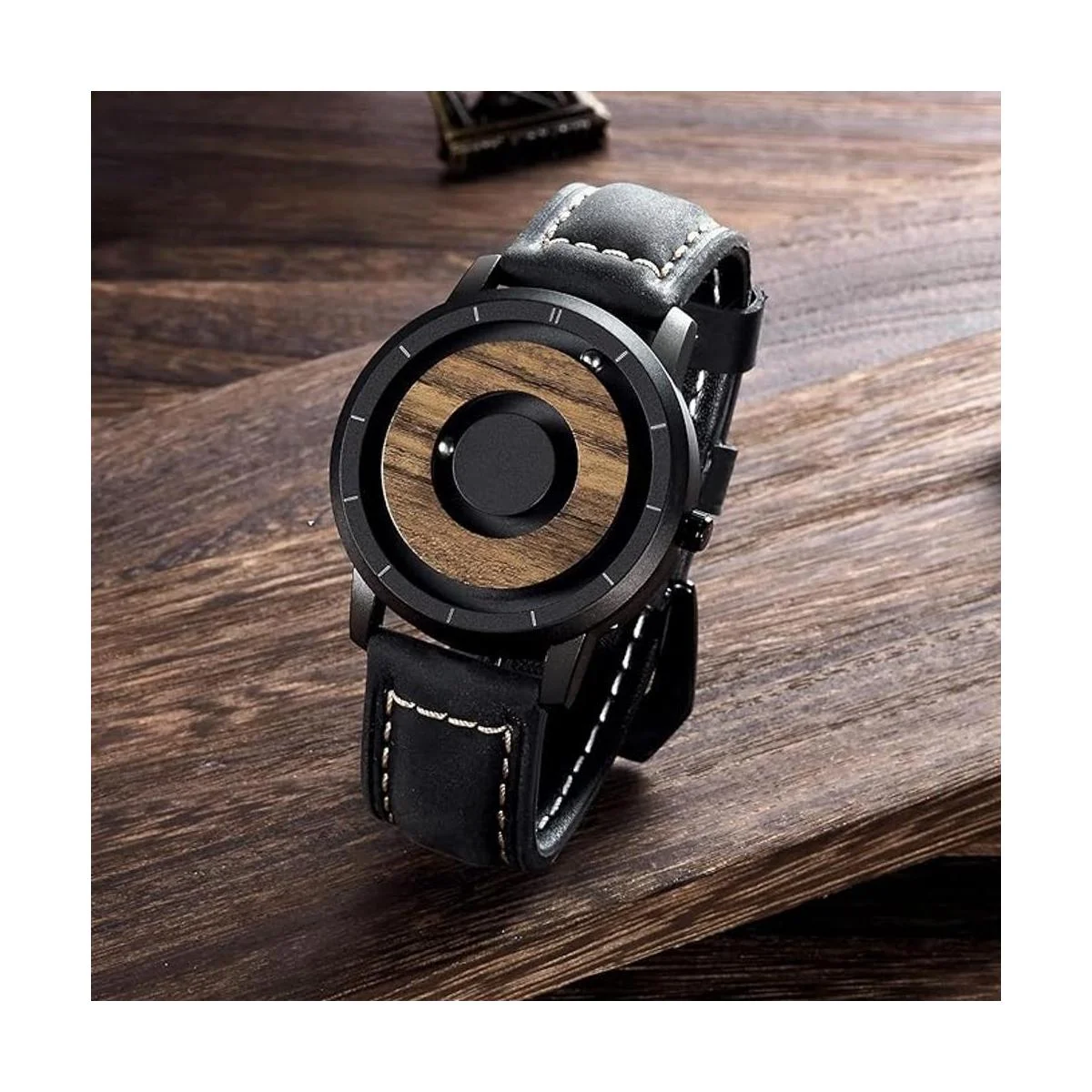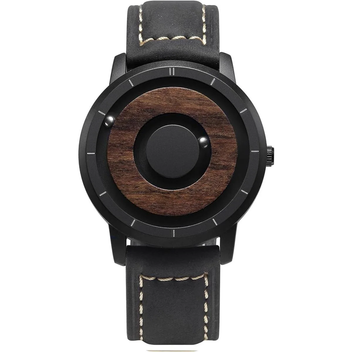 No convencional y original Dos rodamientos de bolas magnéticos viajan alrededor de la esfera del reloj en pistas empotradas separadas. La combinación única de ébano y acero hace que el reloj sea aún más único. Debido a la estructura interna única del reloj magnético, las manecillas han sido diseñadas con una manecilla de minutos interna y una manecilla de hora externa para un rendimiento constante y longevidad. Muchos clientes dicen que se han adaptado al reloj después de usarlo durante algún tiempo.